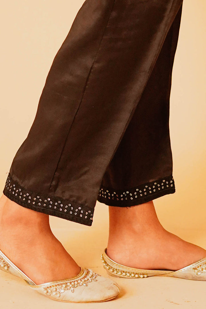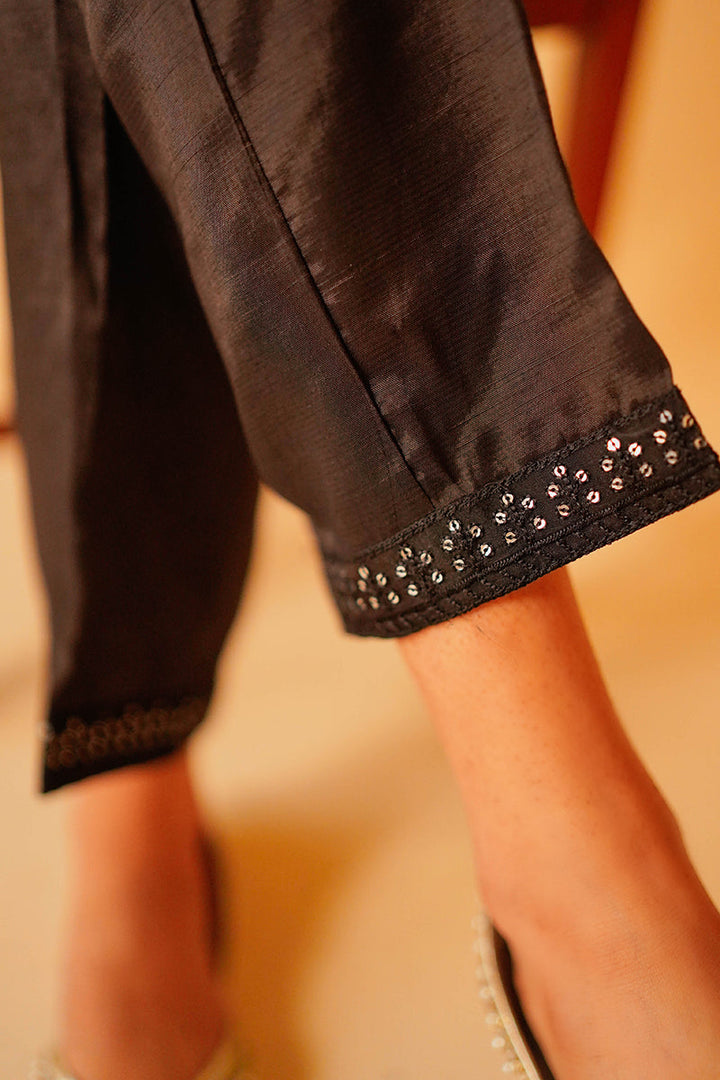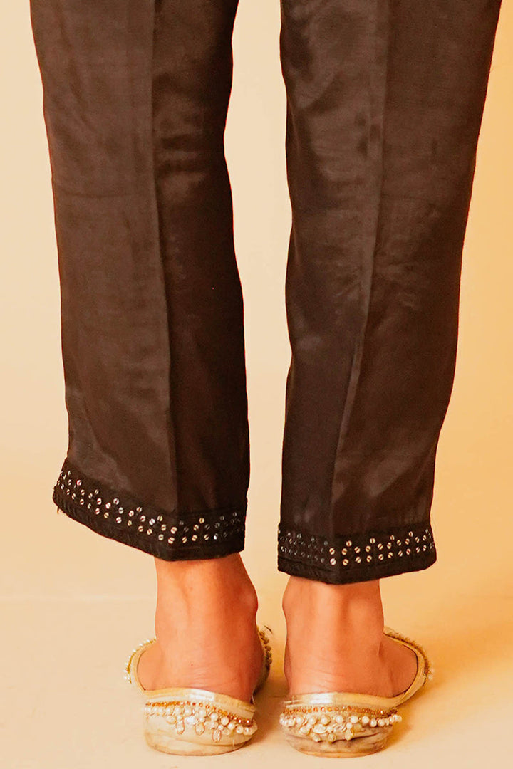 SEQUIN EMBROIDERED RAW SILK STRAIGHT FITTED PANTS