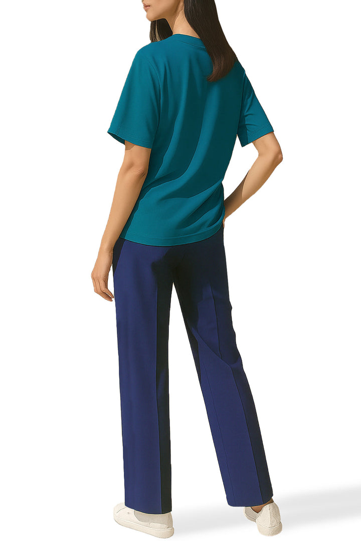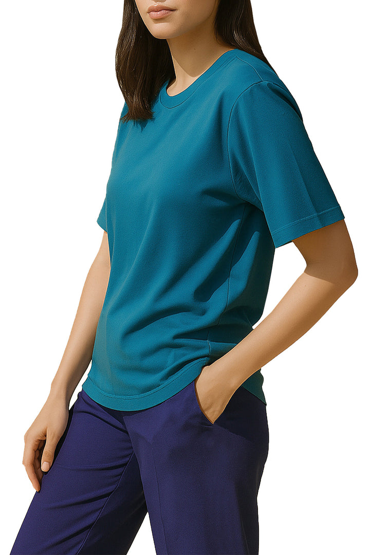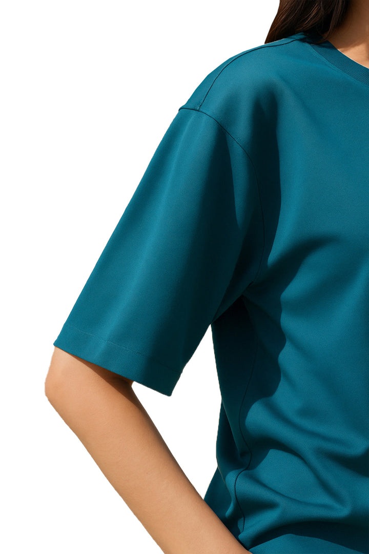 The “Drop Shoulder Tee – Atlantic Teal” By SAYA Blends Contemporary Ease With Understated Earthy Elegance. Crafted From Silky Scuba Fabric, This Tee Features A Soft Texture, Light Stretch, And A Structured Drape That Holds Its Shape Beautifully. The Drop Shoulder Silhouette Delivers A Relaxed, Effortless Fit, While The Muted “Atlantic Teal” Shade Adds A Touch Of Calm Sophistication. Designed For Versatility, It’s Ideal For Casual Days, Travel, Or Layered Styling—A Modern Essential That Marries Comfort With Elevated Everyday Fashion.