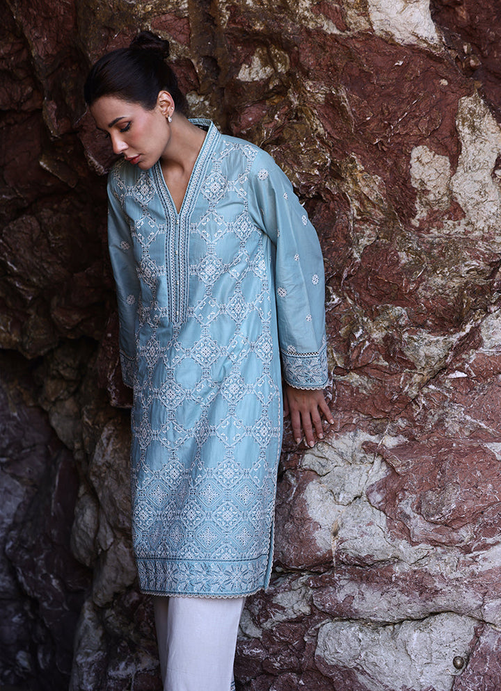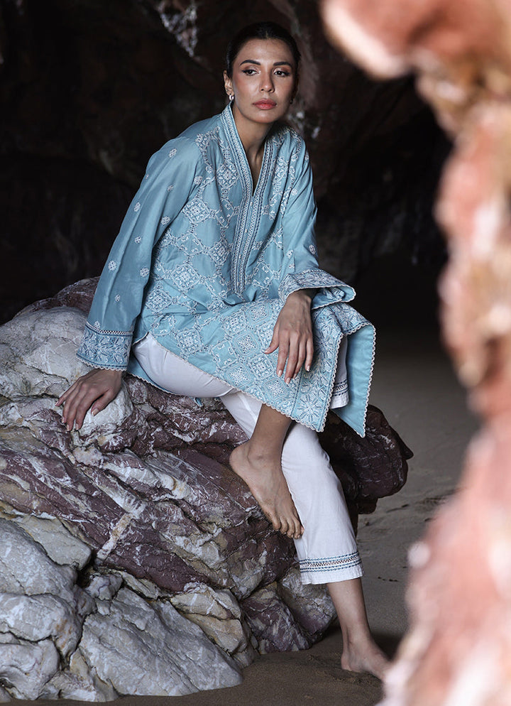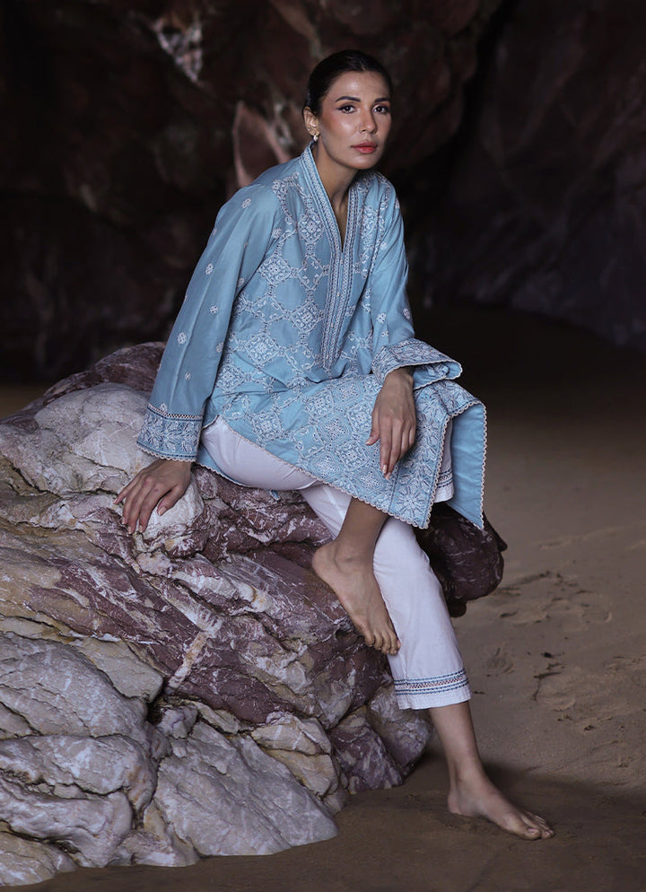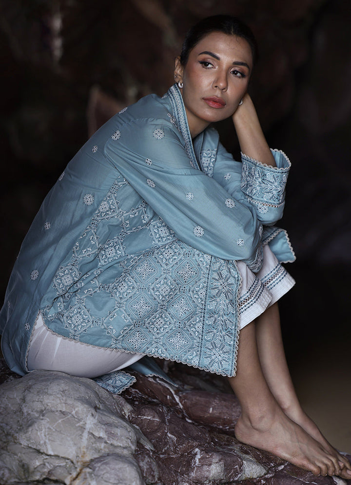 The Sky Blue/White Cotton Embroidered Co-ord Set from Spring Pret '25 features an embroidered shirt with V neckline and full-length sleeves paired with embroidered trousers.