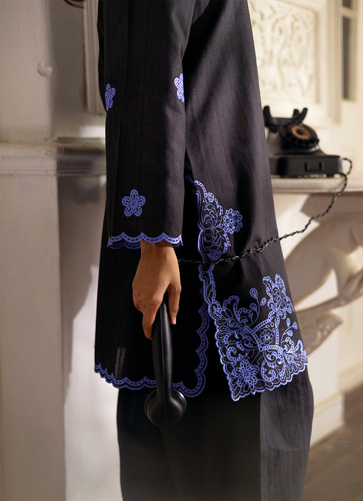 The Black Jacquard Embroidered Co-ord Set from Summer Essence '25, features V neckline & full-length sleeves paired with embroidered trousers.