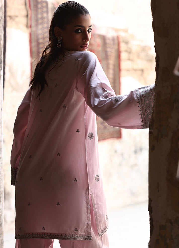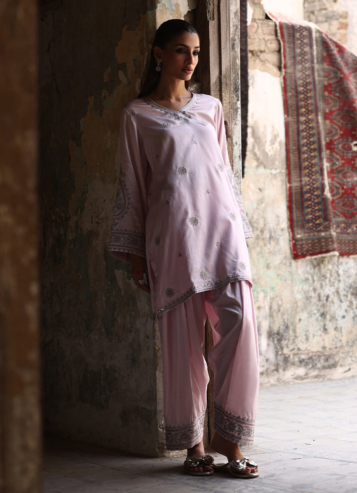 The Fresh Pink cotton satin embroidered co-ord set features V neckline, full-length sleeves paired with an embroidered shalwar.