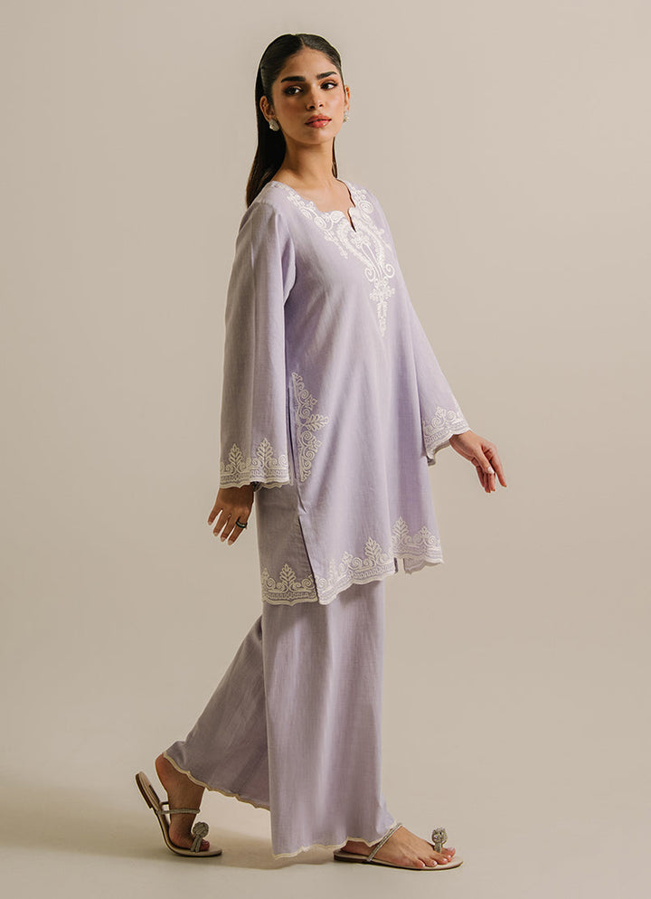 The Lilac Yarn Dyed Embroidered Co-ord Set from our Image Daily category features round neckline with a slit & full-length bell sleeves paired with embroidered trousers.