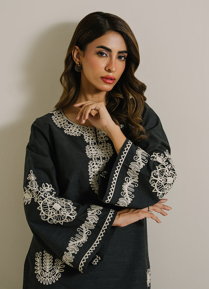 The Charcoal Grey Yarn Dyed Embroidered CO-ORD Set from our Image Daily category features round neckline with a slit & full-length bell sleeves paired with embroidered trousers.