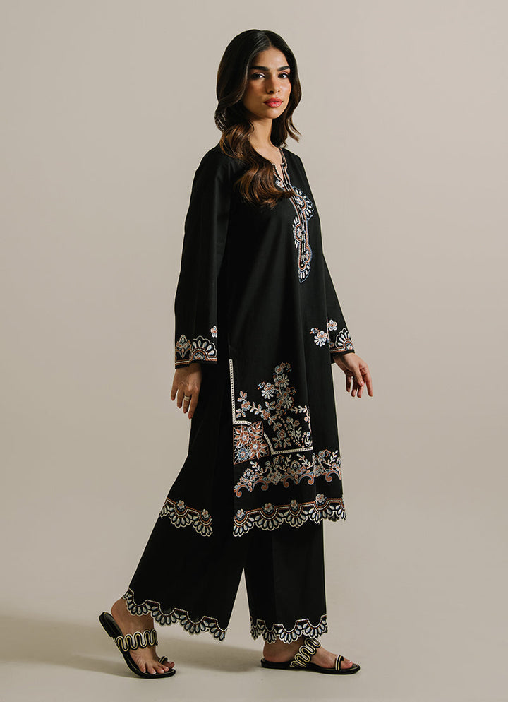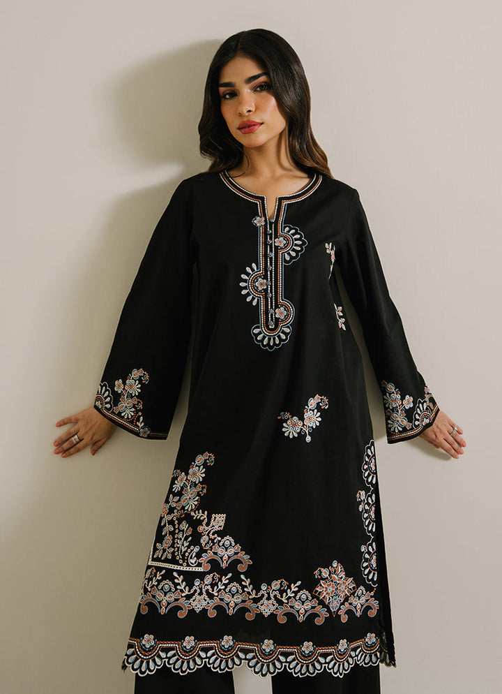The Black Cotton Embroidered Co-ord Set from our Image Signature category features a round neckline with a slit & full-length bell sleeves paired with embroidered trousers.
