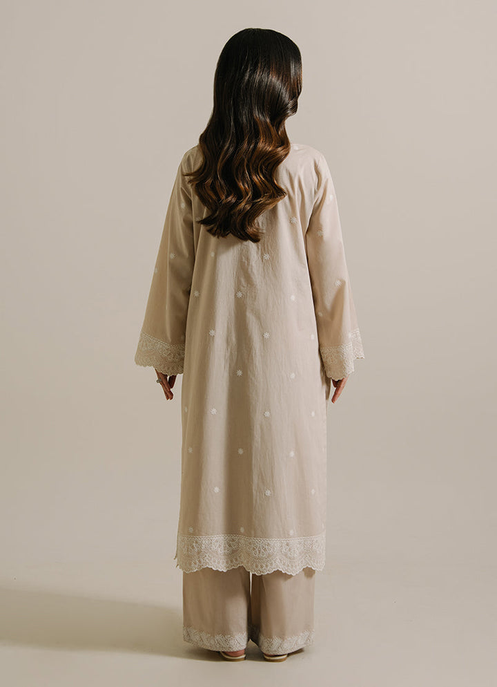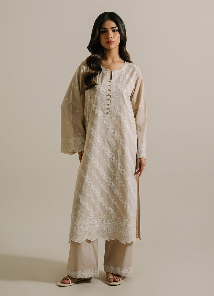The Beige Cotton Embroidered Co-ord Set from our Image Signature category features a round neckline with a slit & full-length bell sleeves paired with embroidered trousers.