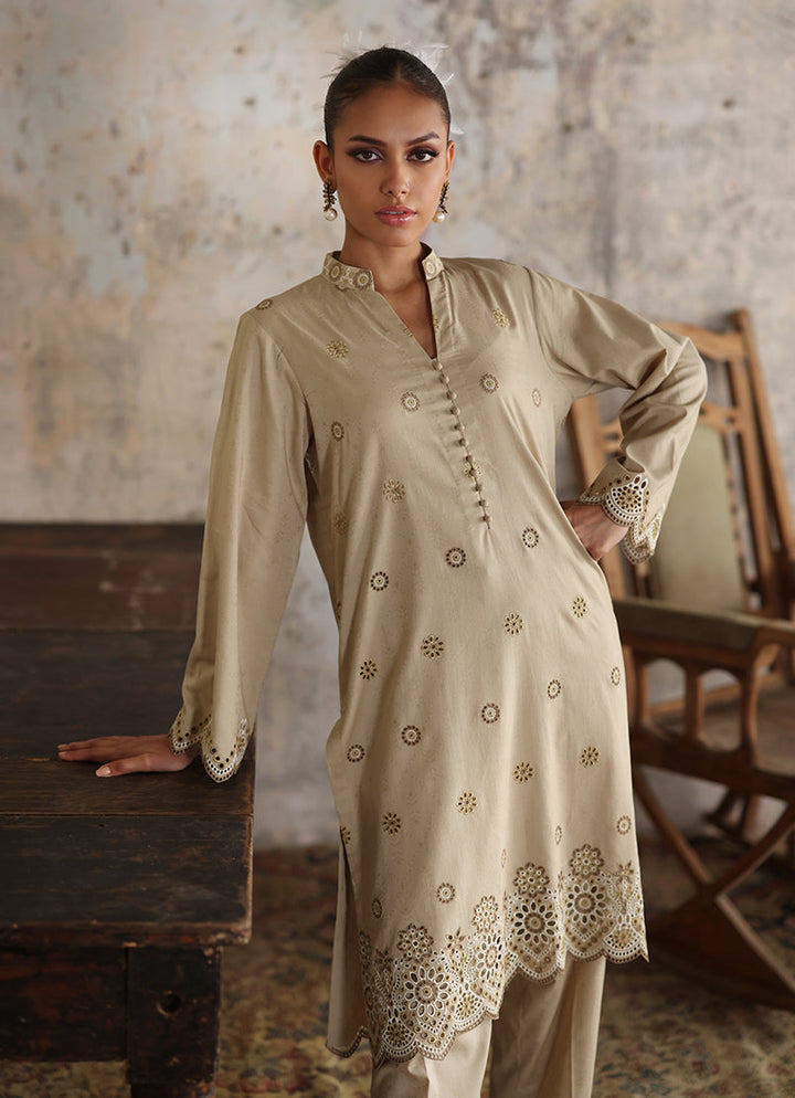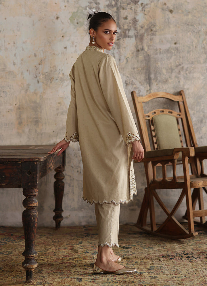 The Beige Jacquard Co-Ord Set from our Endless Summer '24 Collection. This 2-piece set includes a band collar neck with pearl emelishment, scallop cut on sleeves and hemline paired with jacquard trousers.