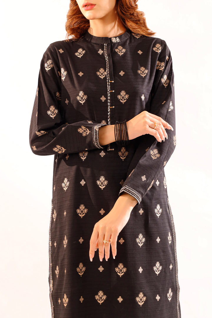 Make a bold yet elegant statement with this Shirt in premium Cotton Jacquard, featuring an intricate embroidered neckline and sleeves that elevate its aesthetic charm. Crafted to perfection, the mid-length design merges traditional weaving with a modern silhouette—perfectly balancing poise with comfort. This ready-to-wear top blends breathable versatility with refined sophistication, ideal for semi-formal gatherings or effortlessly stylish everyday looks.