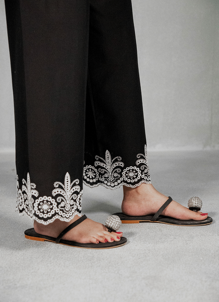 Crafted using soft cotton, these trousers boast intricate schiffli embroidery that adorn the edges. The loose fit of the culottes is designed to let you move freely without sacrificing style.