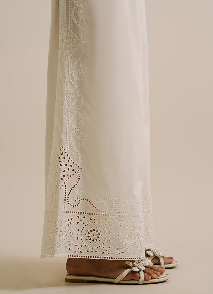 The White Cotton Embroidered Izaar featuring relax fitting and culotte design.