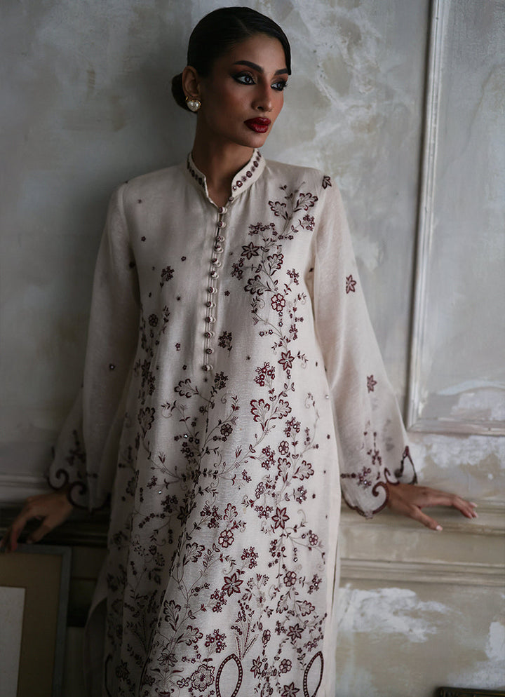 The Beige Karandi Organza embroidered kurta from our Tashkent collection which features a band collar and full-length sleeves