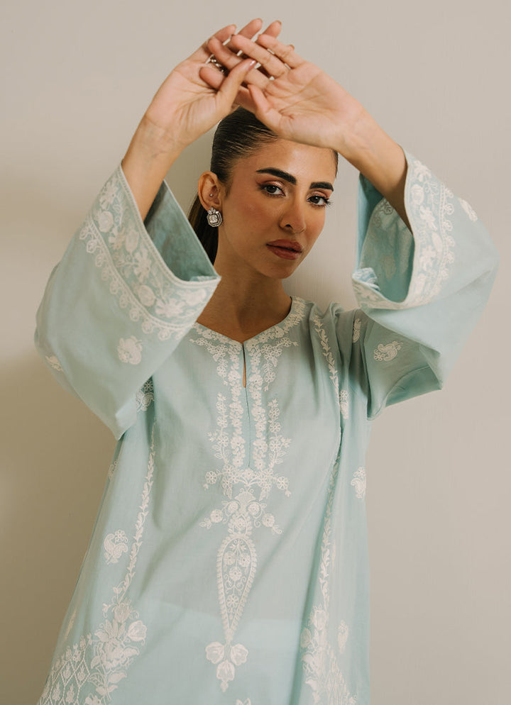 The Light Blue Cotton Embroidered Kurta from our Image Signature category features round neckline with a slit & full-length bell sleeves.