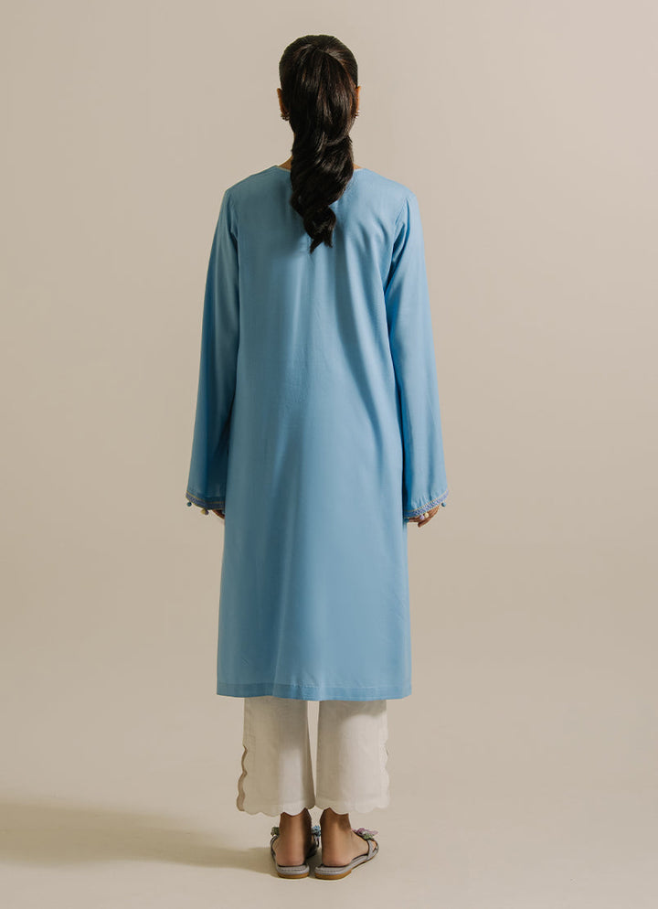 The Blue Viscose Embroidered Kurta from our Image Basic category features round neckline with a slit & full-length bell sleeves.