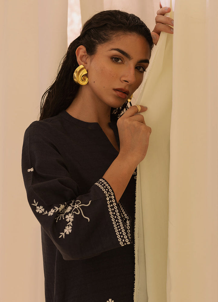 The Charcoal Blue Jacquard Embroidered Kurta from our Spring Collection '25 features an embroidered shirt with band collar and three-quarter sleeves.