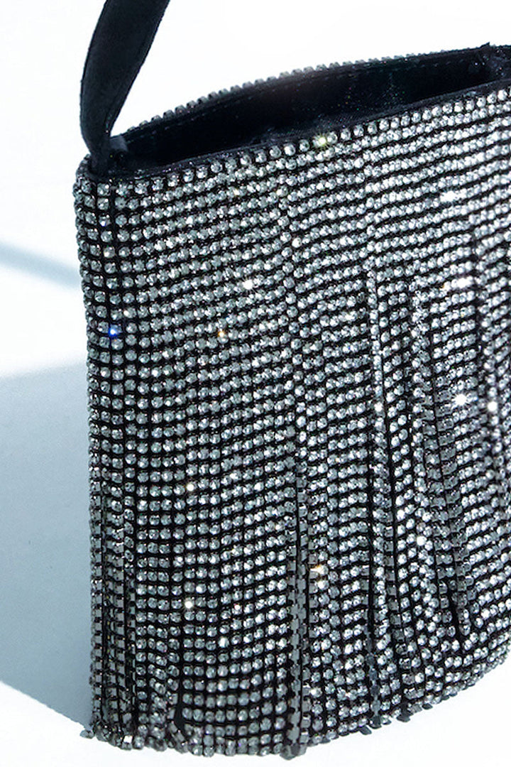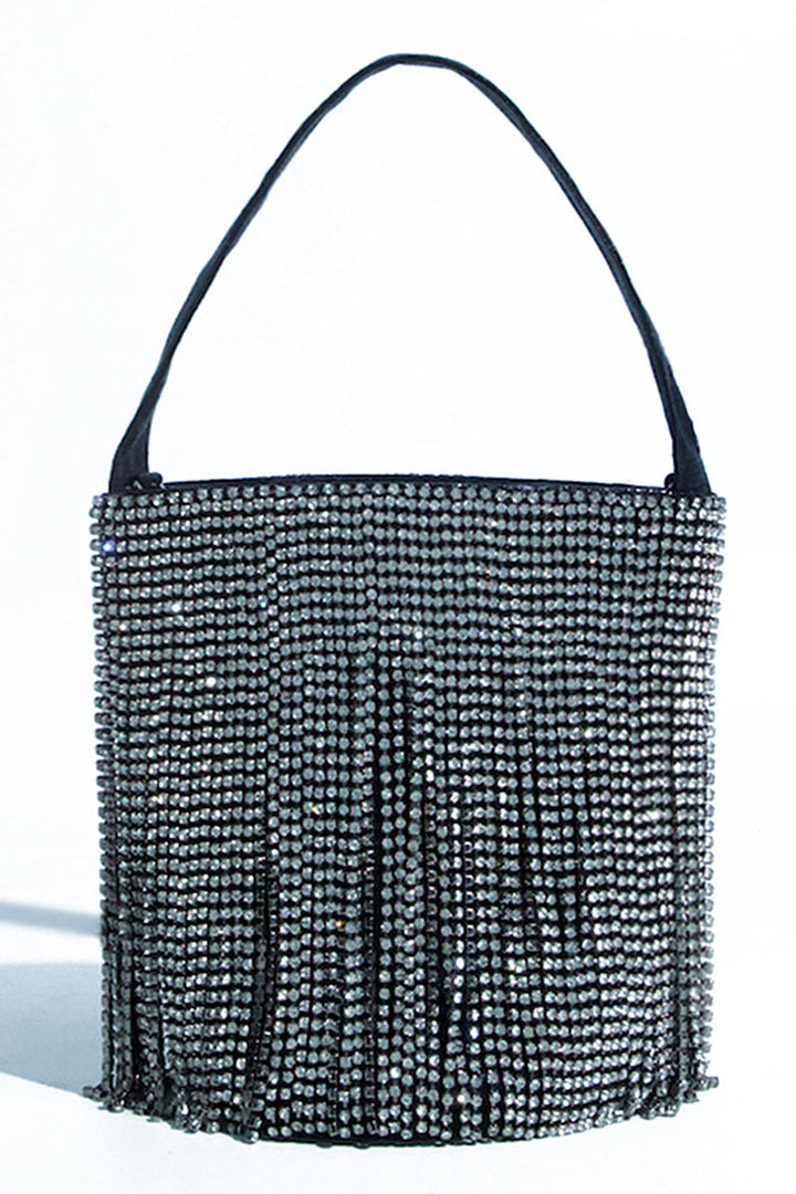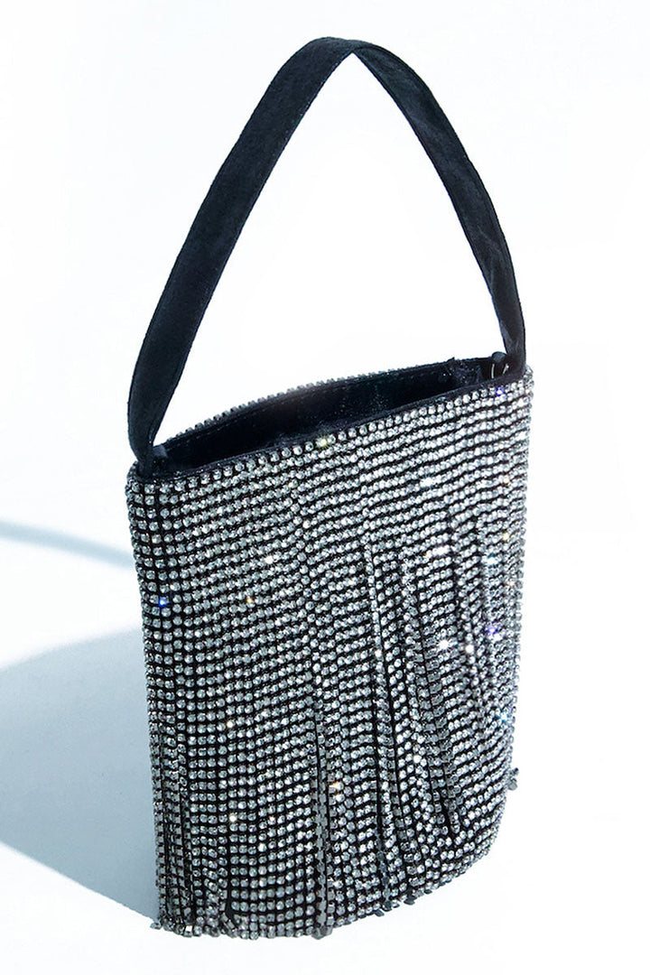 EVELYN is a black embellished handbag that measures 6.4 inches in height and 6.6 inches in width, making it the perfect size for everyday use. Complete with a long chain, this stylish handbag offers the perfect combination of functionality and fashion.