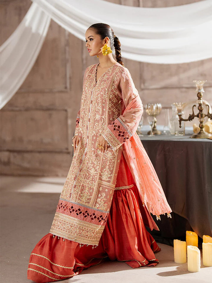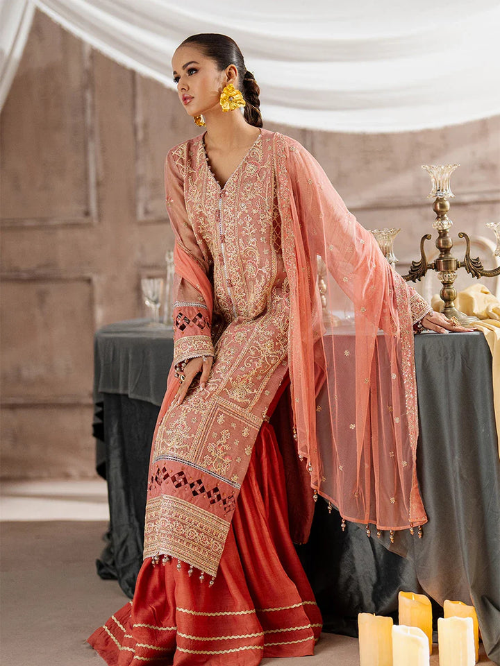 Luxury embroidered net front with dori and sequin detailing, paired with dyed lurex cotton net back, side panels, and sleeves featuring intricate embroidery. Includes an embroidered net embellished dupatta, plain crape trousers, and beautifully embroidered borders for a sophisticated finish.