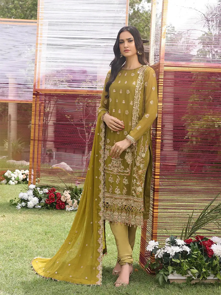 Celebrate tradition in our mehndi green chiffon ensemble, beautifully adorned with intricate zari and sequin work—perfect for a rich and festive look