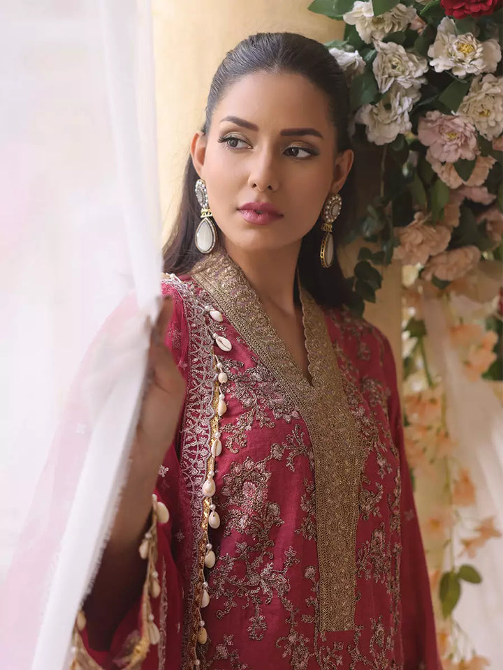 Embrace opulence with our luxurious maroon ensemble, adorned with intricate embroidery and regal zari work in gold. A timeless masterpiece that exudes royalty and elegance in every stitch