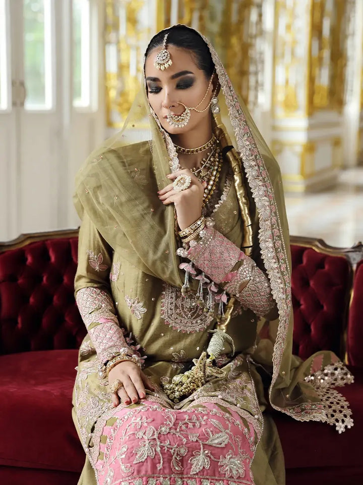 Step into sophistication with our mehndi green ensemble, featuring exquisite gold embroidery. Perfect for formal wear, this luxurious design brings elegance and charm to every occasion