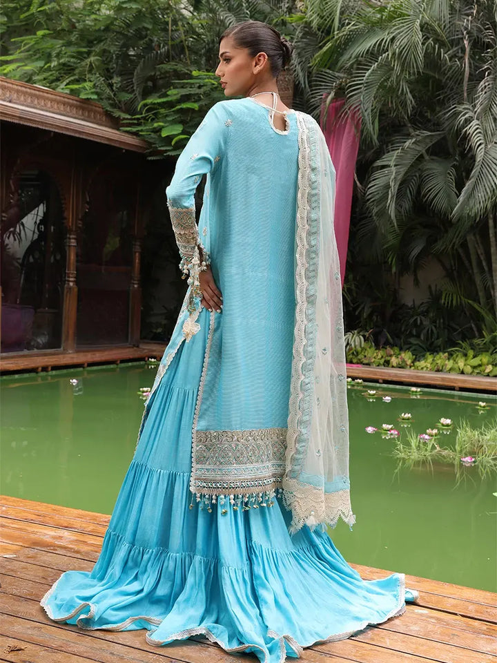 Radiate charm with our bright blue ensemble, featuring exquisite embroidery and shimmering sequin accents. This vibrant and eye-catching outfit is perfect for adding a pop of color to any occasion