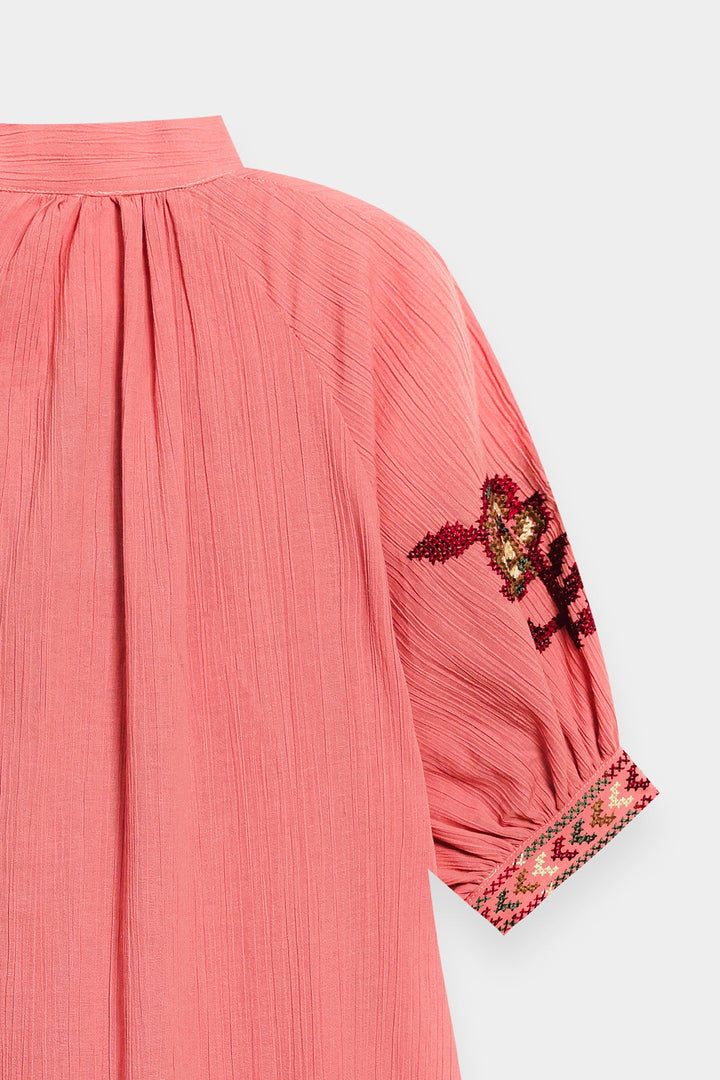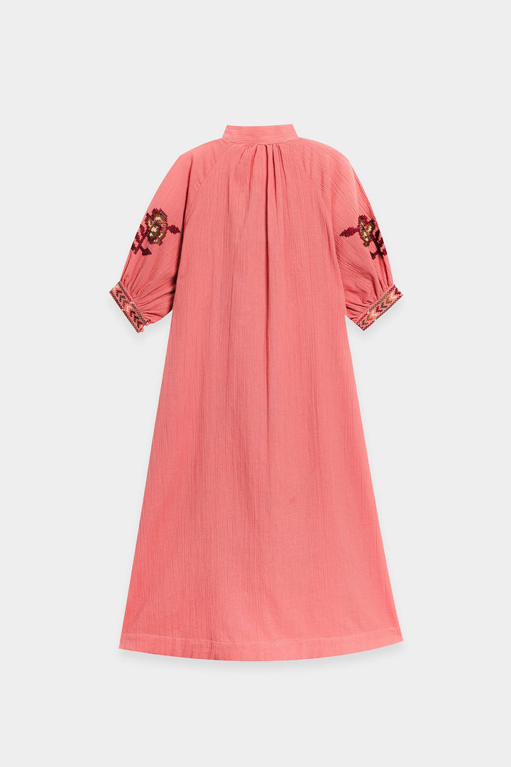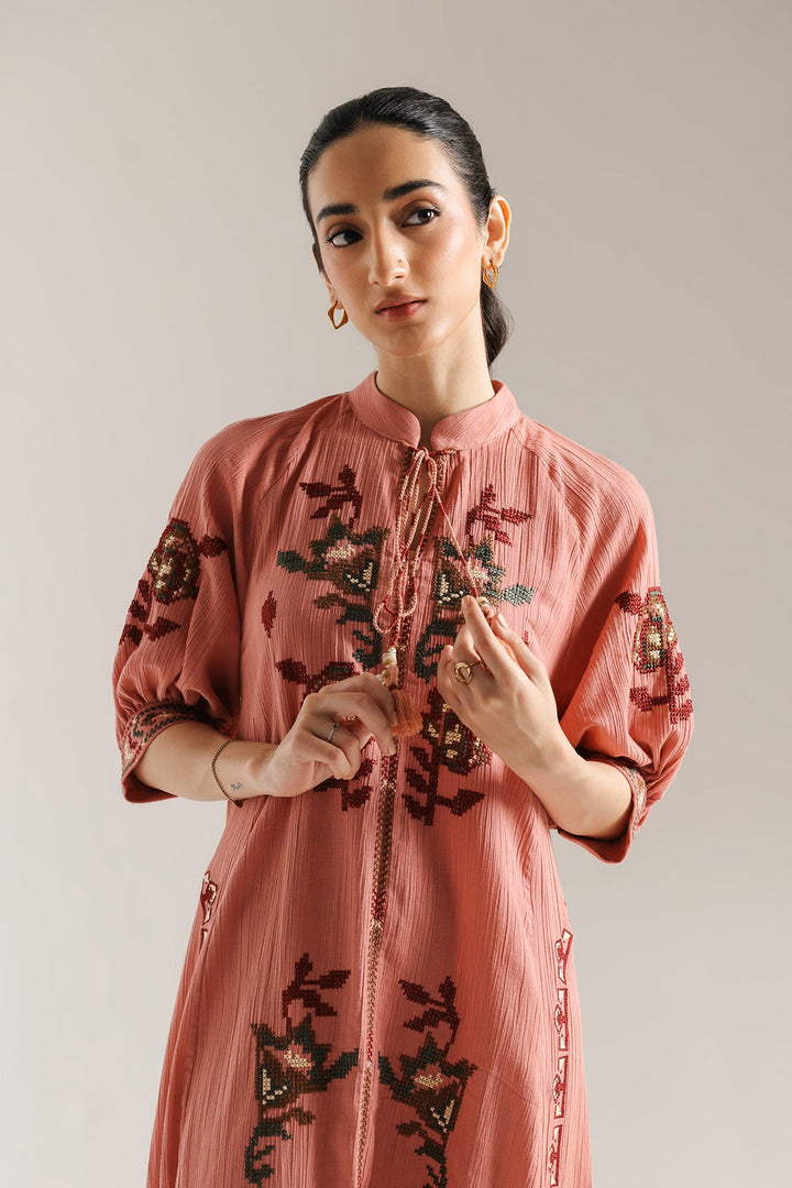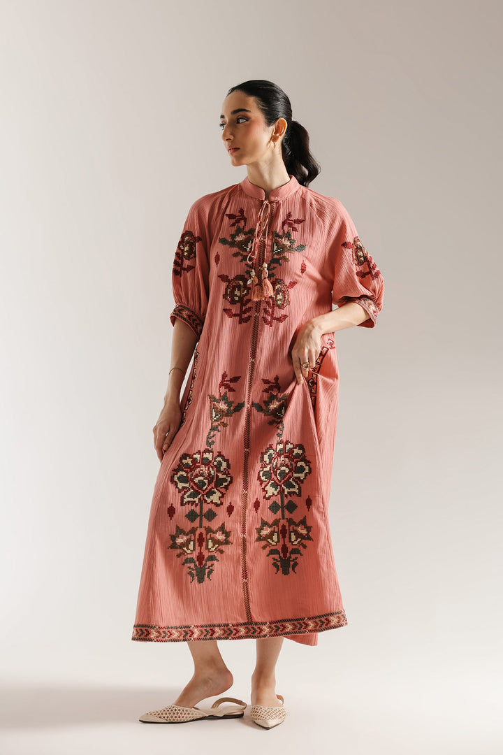 Make a statement in this stunning embroidered dress. This dress is a beautiful peach color and features intricate floral embroidery throughout. The long, flowing silhouette and the tie-up detail at the neckline add to its unique and elegant charm. With its comfortable fit and beautiful design, this dress is perfect for any occasion.