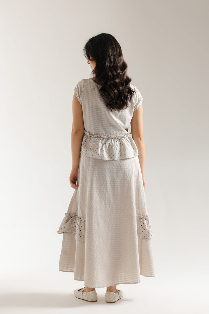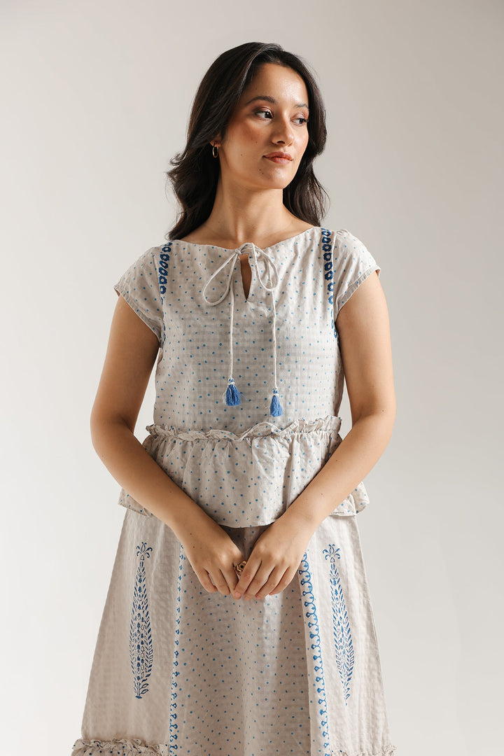 Drift through your day in this light, whimsical printed dress, a beautiful ensemble crafted from a comfortable, light beige fabric with an all-over blue dotted print. The top features a short-sleeved silhouette with a delicate peplum detail at the waist and a round neckline that is finished with playful blue tassels. Adding an artisanal touch, the yoke and shoulders are accented with delicate blue flower print. The long skirt boasts a feminine tiered silhouette, incorporating a contrasting block print pattern on the lower panel and small ruffles for charming movement. This dress is the perfect choice for a soft, comfortable, and effortlessly chic daytime look.