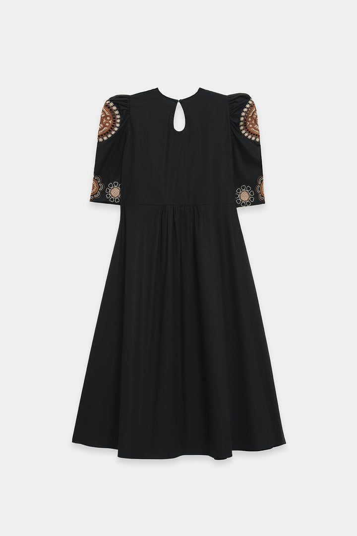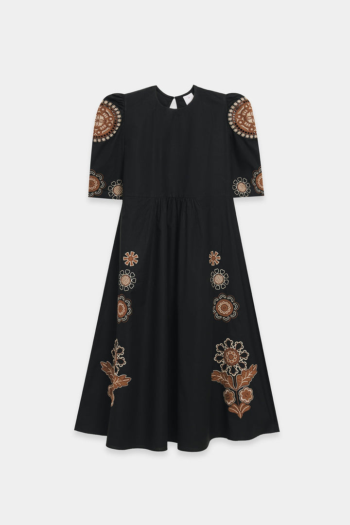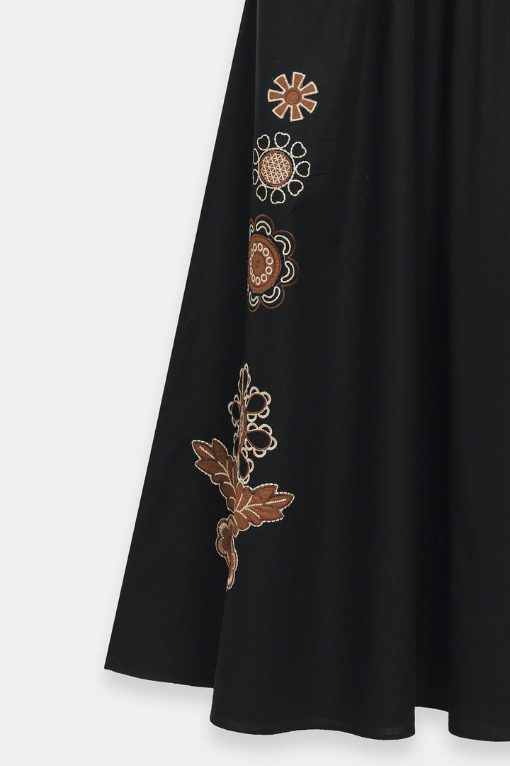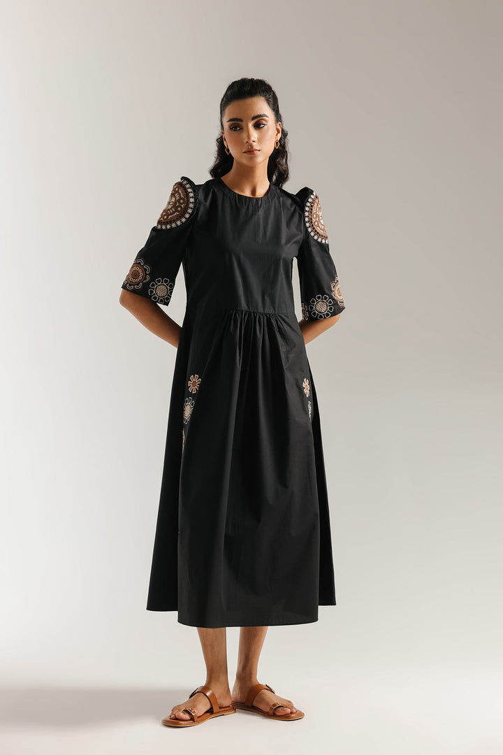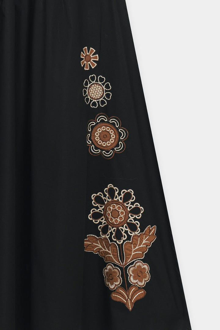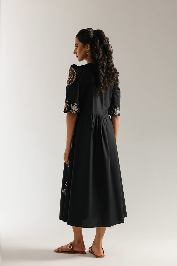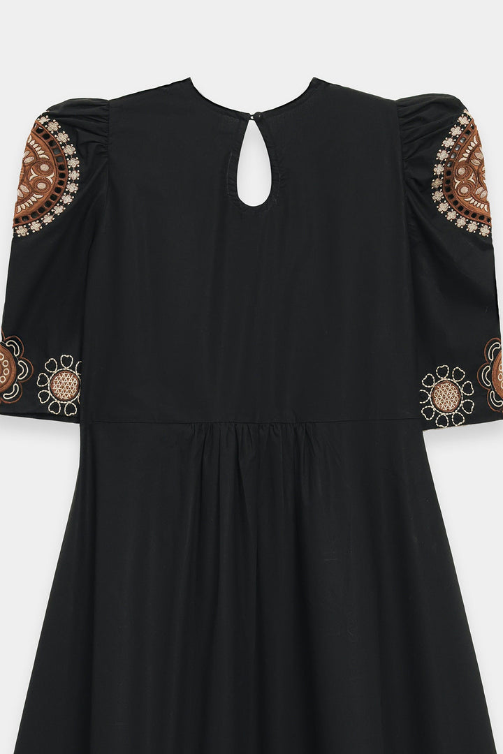 Embrace a look of rustic elegance with this stunning embroidered dress. This beautiful black dress features a comfortable, flowing silhouette. It is a stunning canvas for the large, intricate, floral, and circular motifs embroidered in a beautiful blend of white, gold, and brown threads. The short sleeves and the unique design make this dress perfect for any event.