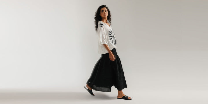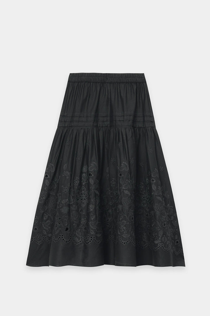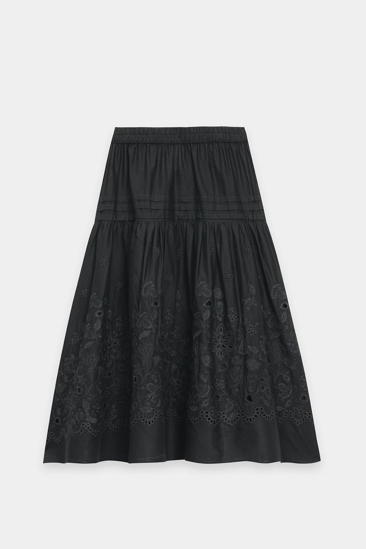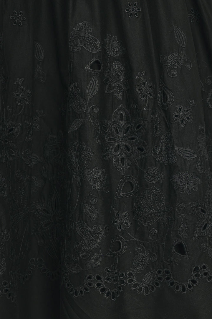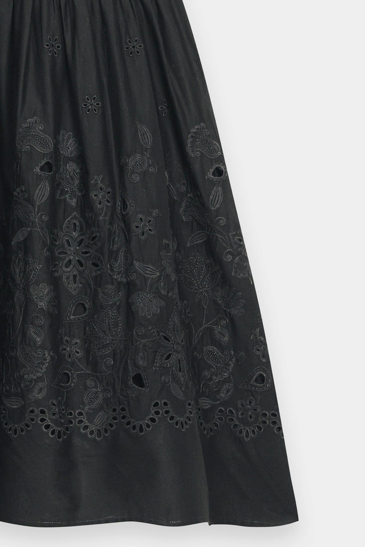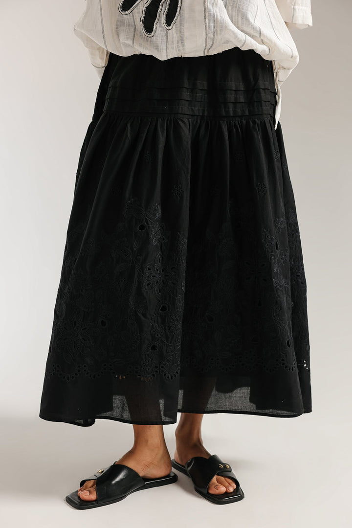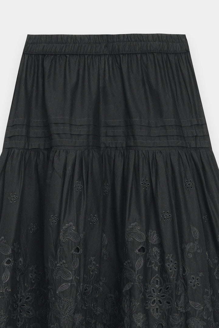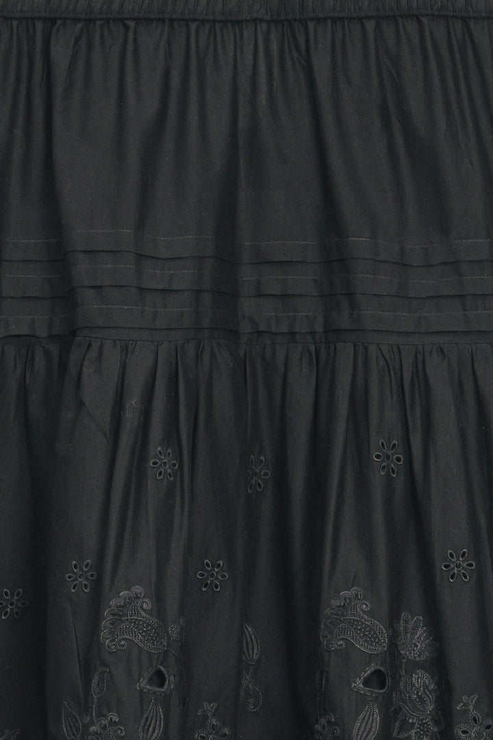 Elevate your look with this elegant and versatile black skirt. This beautiful black skirt features a classic A-line silhouette with a comfortable, flowing fit. It is adorned with delicate black embroidery and intricate cutwork throughout, creating a look that is both sophisticated and unique. The skirt is perfect for pairing with a variety of tops, making it a stylish addition to any wardrobe.