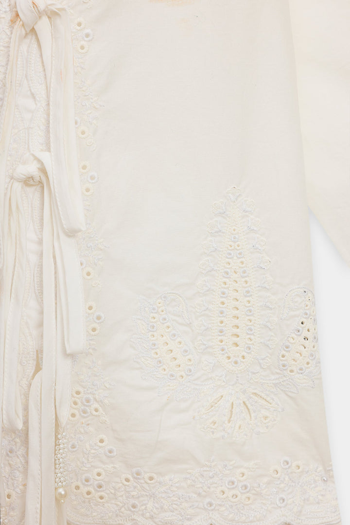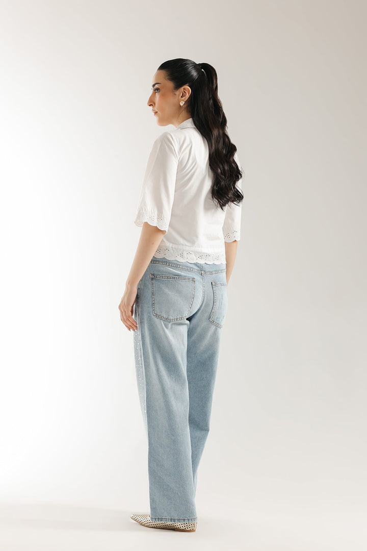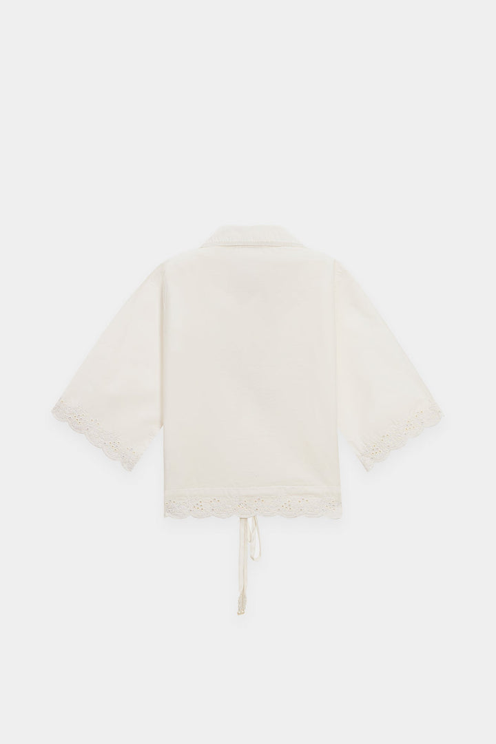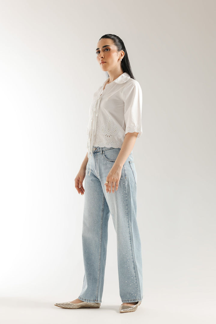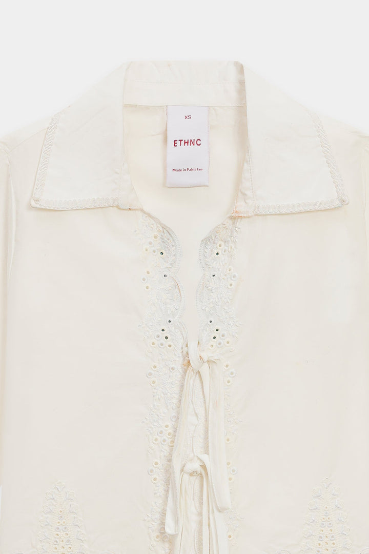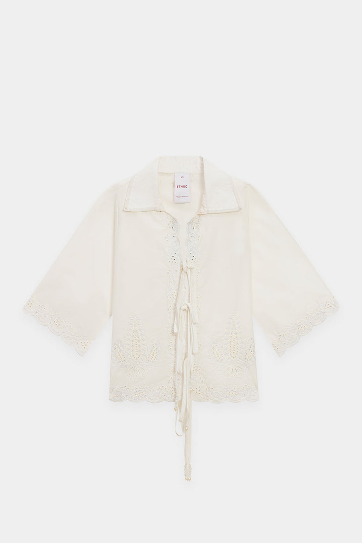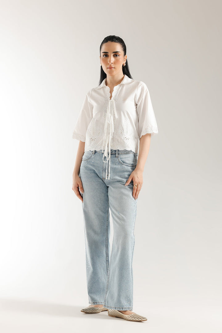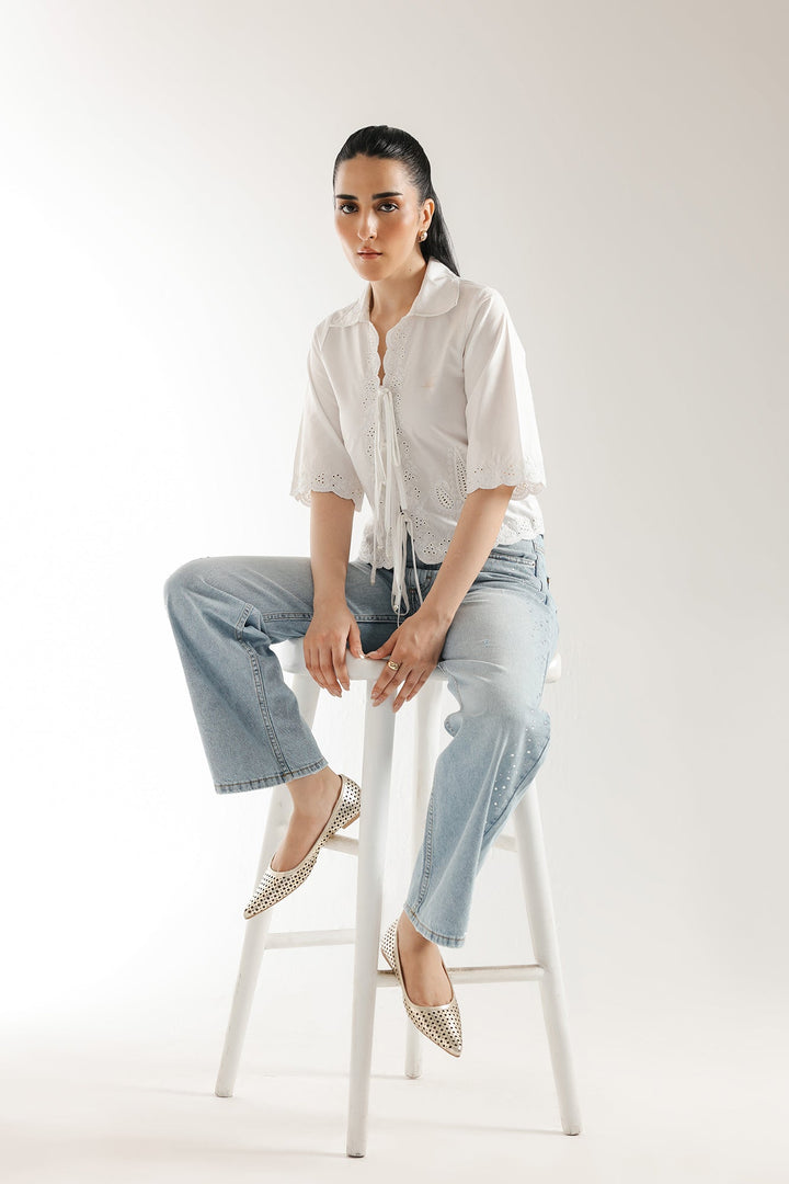 Elevate your everyday style with this charming white shirt. Crafted from light and breathable fabric, it features delicate eyelet details that add a touch of feminine elegance. Pair this versatile top with your favorite bottoms for a fresh and effortlessly chic look.