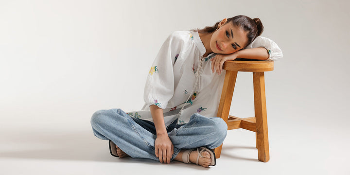 Breathe a breath of fresh style into your wardrobe with this charming off-white top. Adorned with vibrant floral embroidery scattered across the fabric, it exudes a playful yet sophisticated vibe. The relaxed silhouette, coupled with the unique drawstring neckline featuring colorful tassel details, adds a touch of bohemian flair. Pair this top with your favorite jeans for an effortlessly chic and comfortable look.