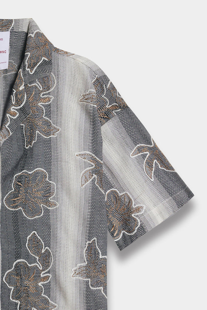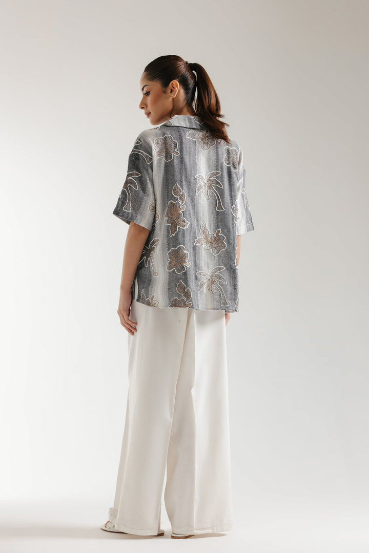 This modern shirt features a stylish design in a captivating off white color. With a sophisticated button down silhouette and an attractive white grey textured canvas, it showcases a refined design embroidered with contrasting white and brown floral designs. Ideal for wearing to any fun events this season.