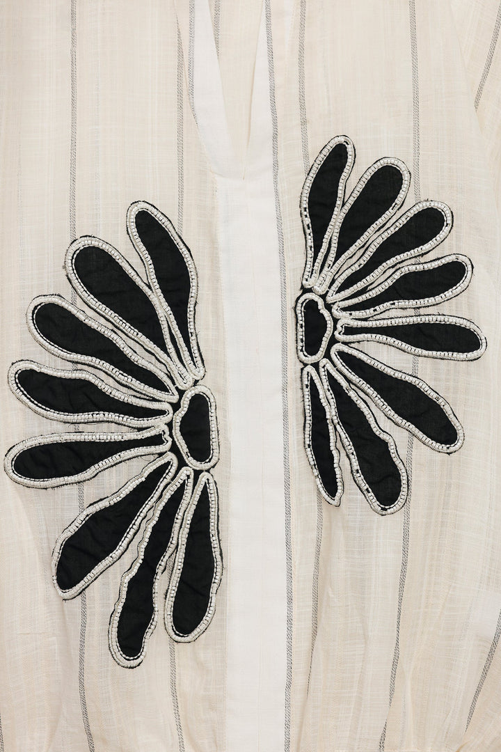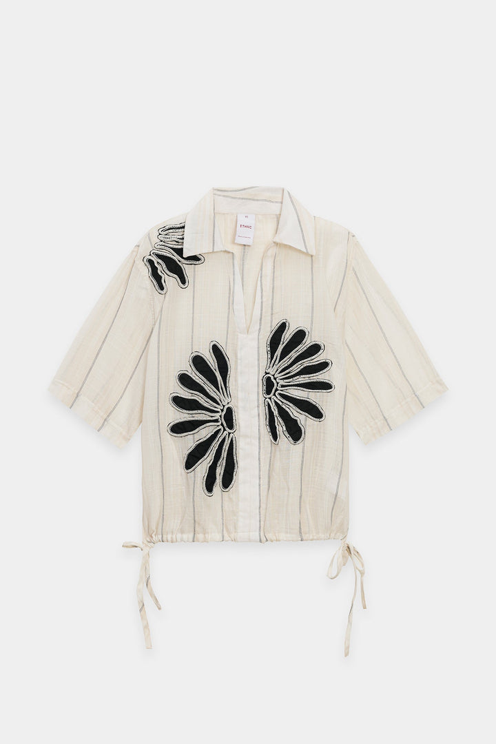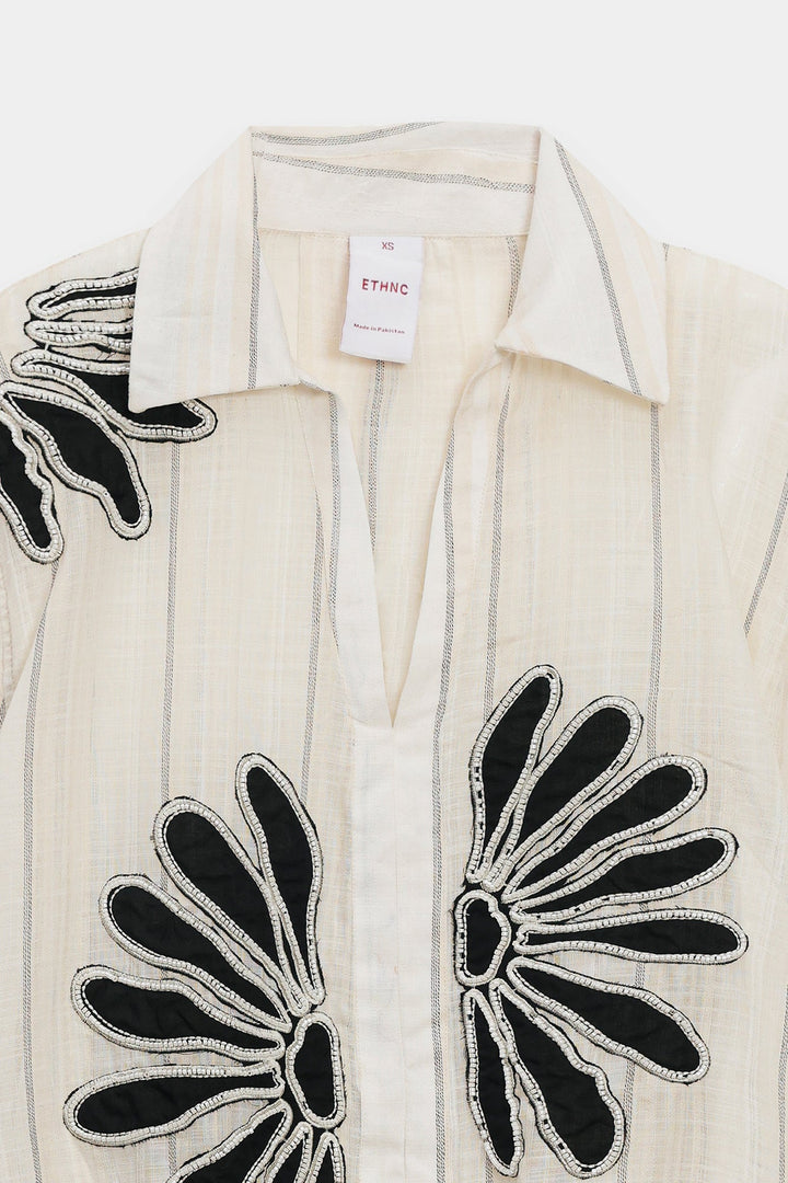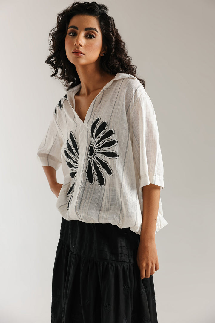 Step out in effortless style with this striking embroidered top. This beautiful white top features a loose, comfortable fit and is crafted from a lightweight, breathable fabric. What makes it truly special are the bold, black floral motifs embroidered on the front and shoulders, creating a captivating and modern design. The top has a classic collared neckline and wide sleeves. This versatile piece is perfect for pairing with a variety of bottoms, making it a stylish addition to any wardrobe.