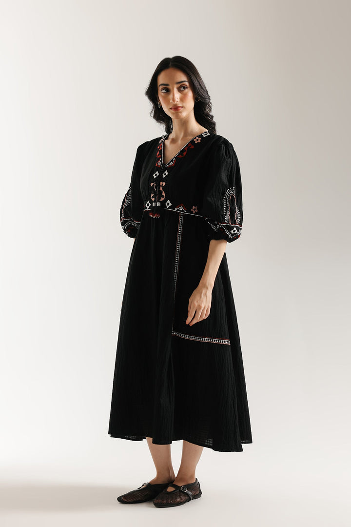 Immerse yourself in folk-inspired artistry with this enchanting embroidered dress. The deep black midi-length dress is crafted from a subtly textured fabric, offering a comfortable and flowing silhouette. The focal point is the intricate, multi-colored embroidery at the neckline and waistline, featuring bold geometric and floral motifs in striking shades of red, white, and pink. Puffed, short sleeves with matching embroidery and vertical stitch lines on the skirt add to its bohemian charm. This dress is a perfect choice for an artistic and unique statement.