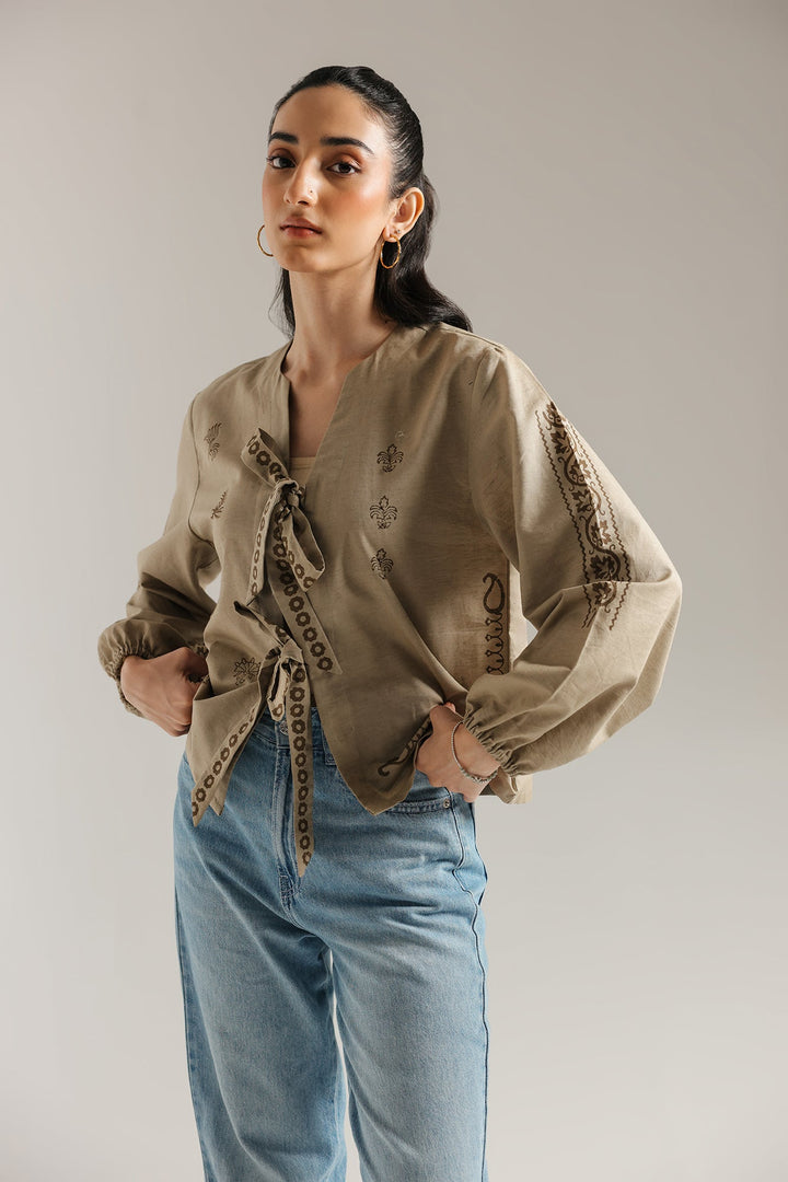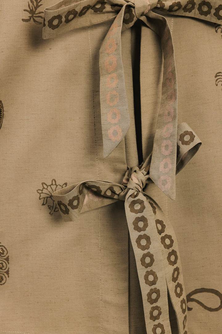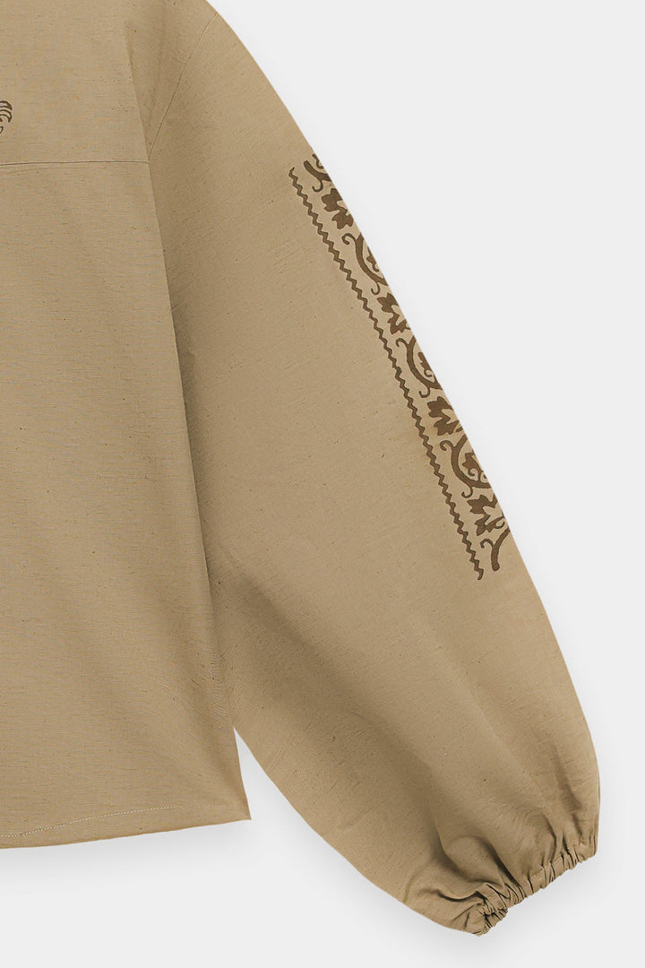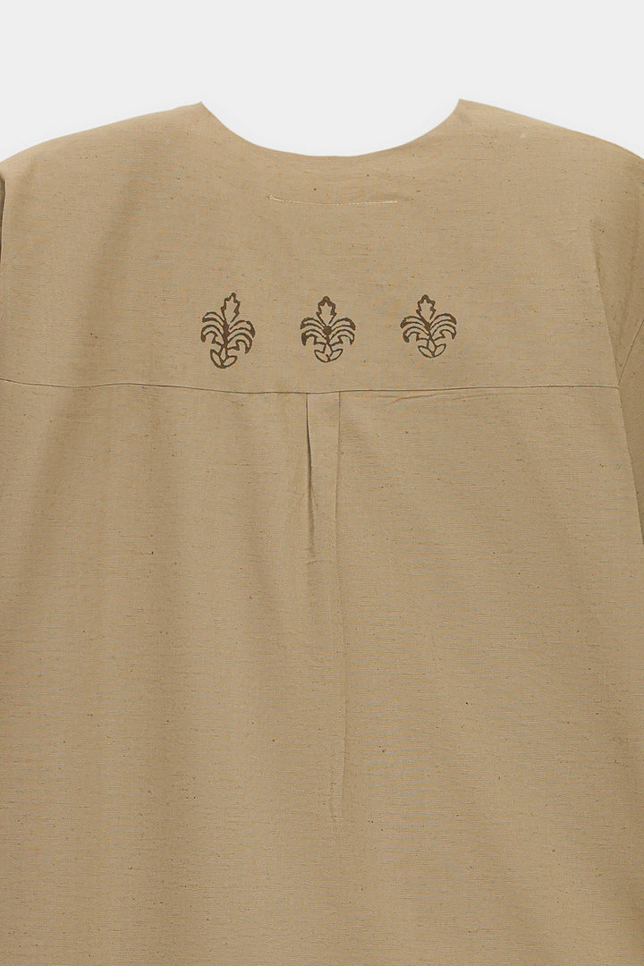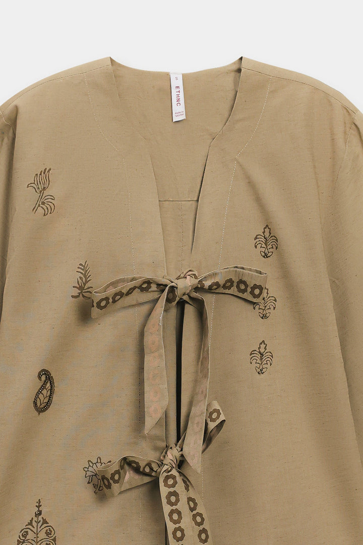 This top is a testament to bohemian artistry, rendered in a soft, natural khaki hue, brought to life by an exquisite block print in a rich brown hue. The relaxed silhouette, coupled with long, full sleeves and a charming tie-up neckline, creates a look that is both free-spirited and elegant.