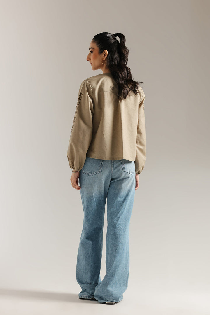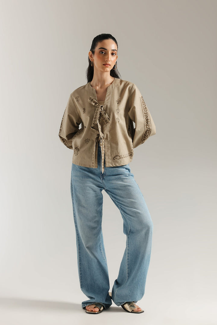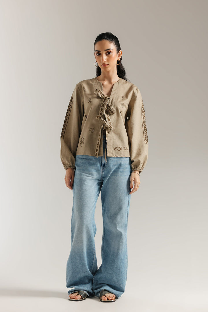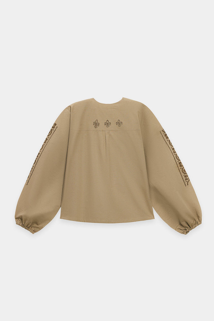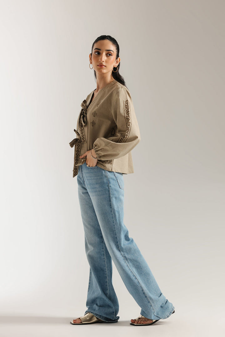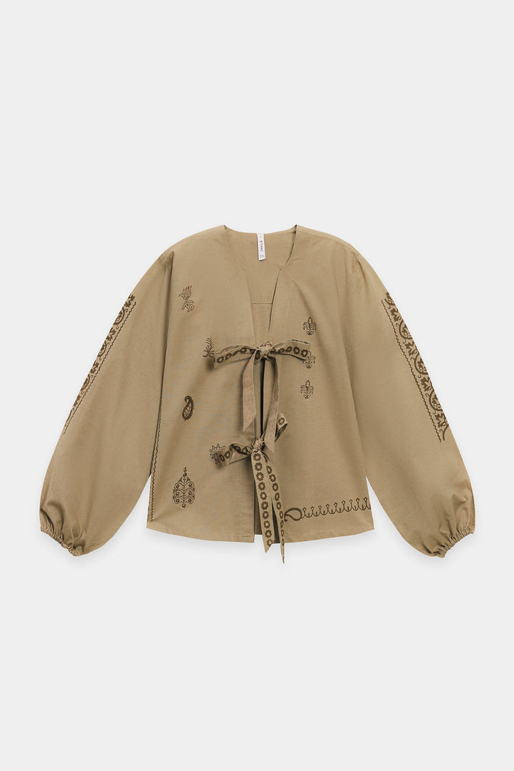 This top is a testament to bohemian artistry, rendered in a soft, natural khaki hue, brought to life by an exquisite block print in a rich brown hue. The relaxed silhouette, coupled with long, full sleeves and a charming tie-up neckline, creates a look that is both free-spirited and elegant.