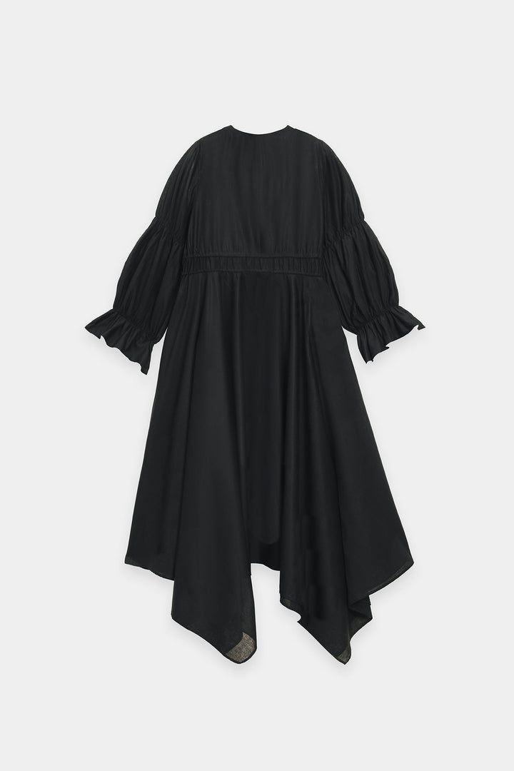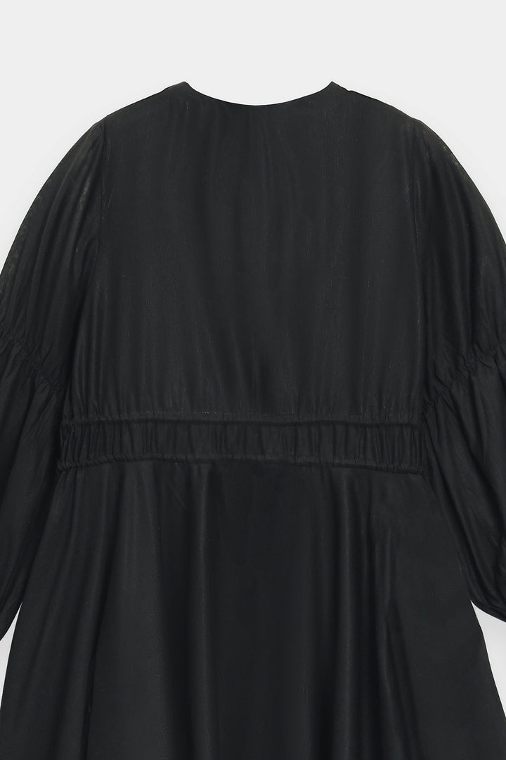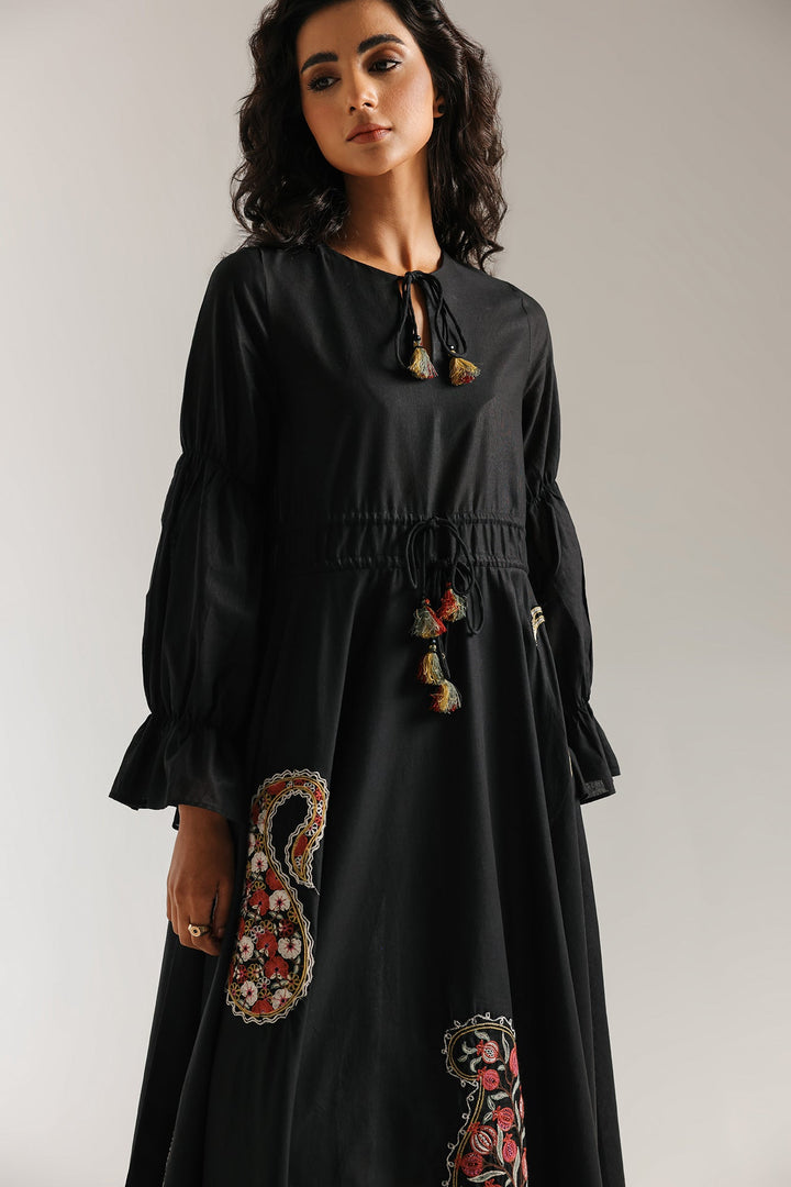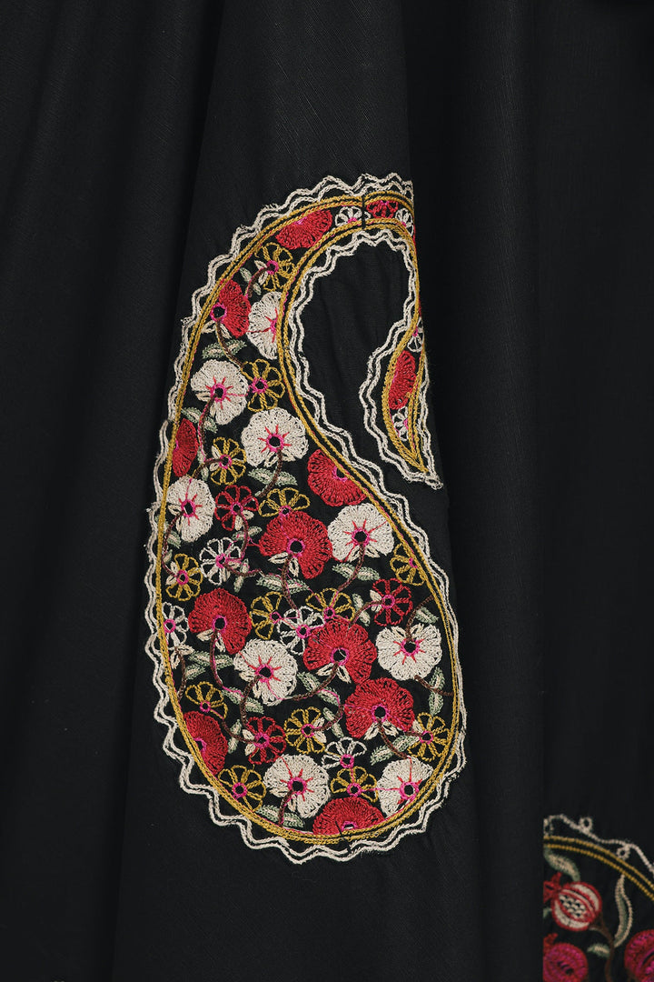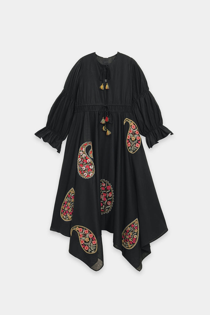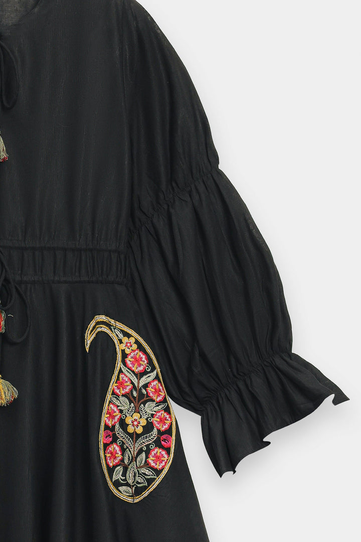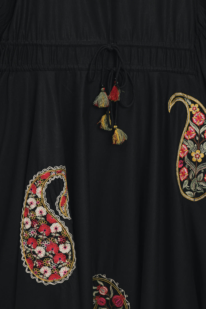 Wrap yourself in a dress that is a masterpiece of art and elegance. This beautiful black dress features a relaxed, flowing fit and is crafted from a soft, lightweight fabric. It is a stunning canvas for the large, intricate paisley and floral motifs embroidered on the front. The bodice is finished with delicate ruffles and tie-up tassels, which add to its unique charm. This versatile dress is perfect for making a stylish statement at any event.