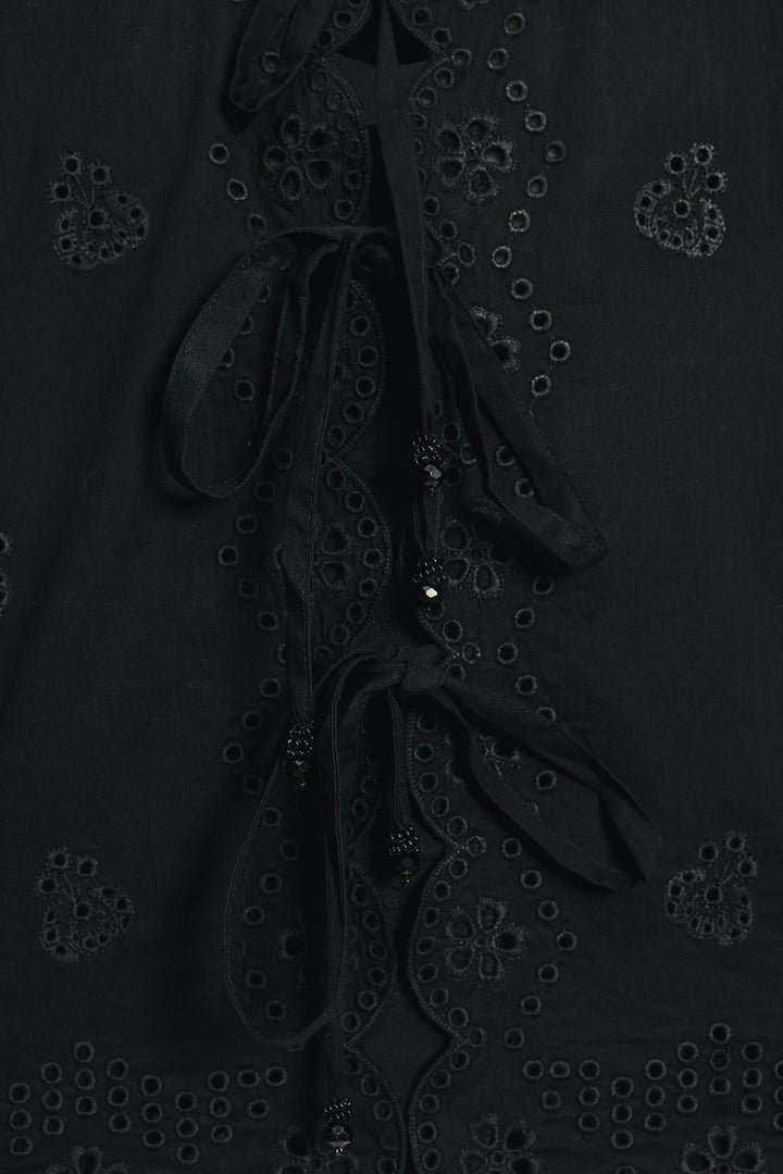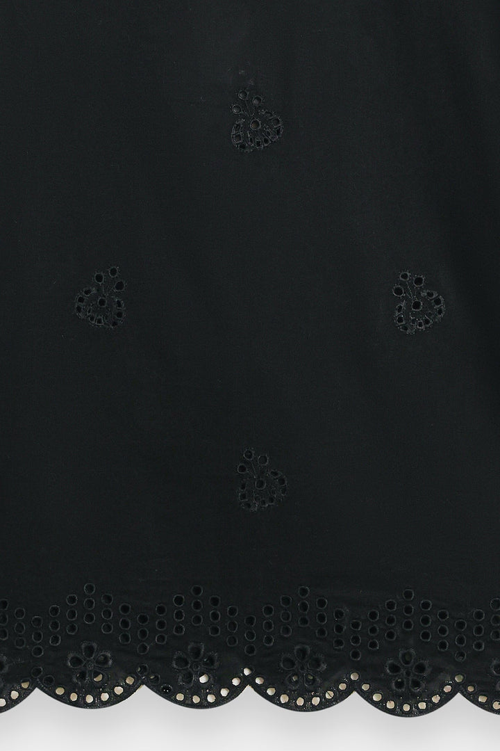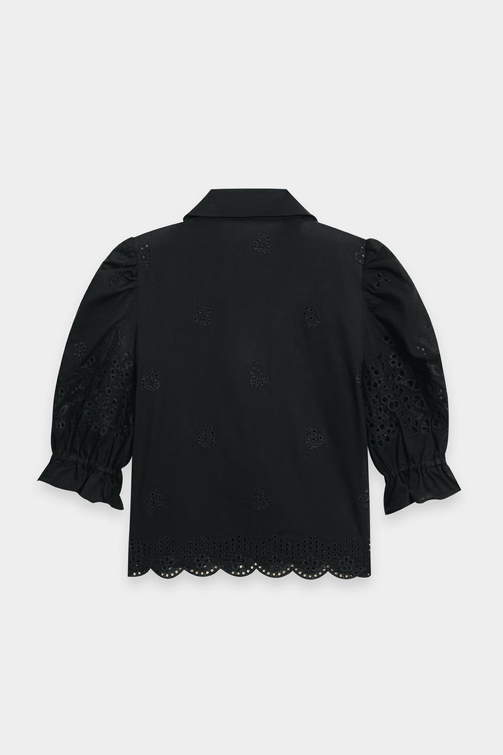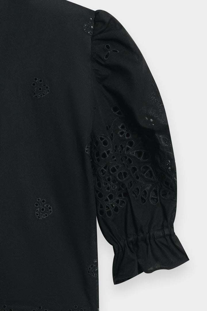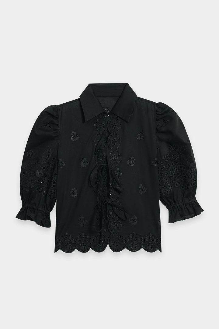 Indulge in timeless sophistication with this charming embroidered top. This beautiful black top features a classic collar neckline with delicate lace-up detailing. The short puff sleeves are gathered at sleeve opening, adding a touch of romance and volume. The top is made from a lightweight, breathable fabric, making it a comfortable and stylish choice for any occasion.