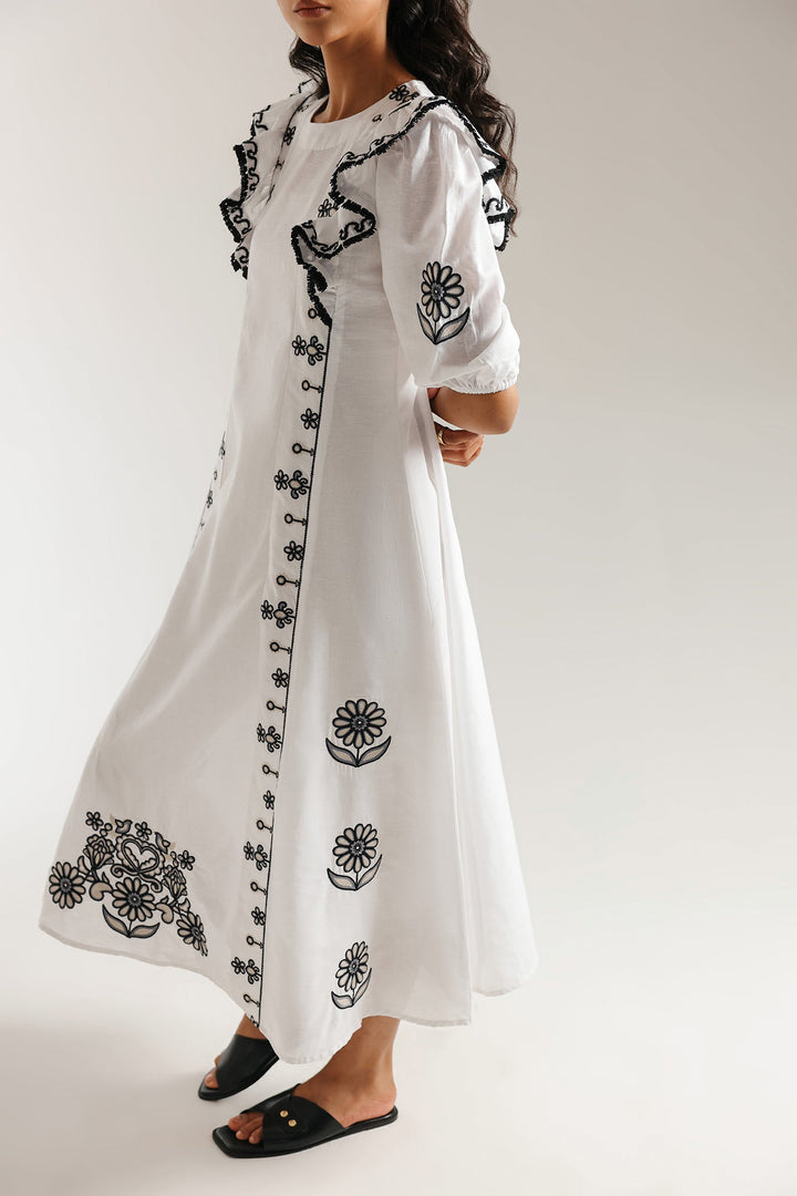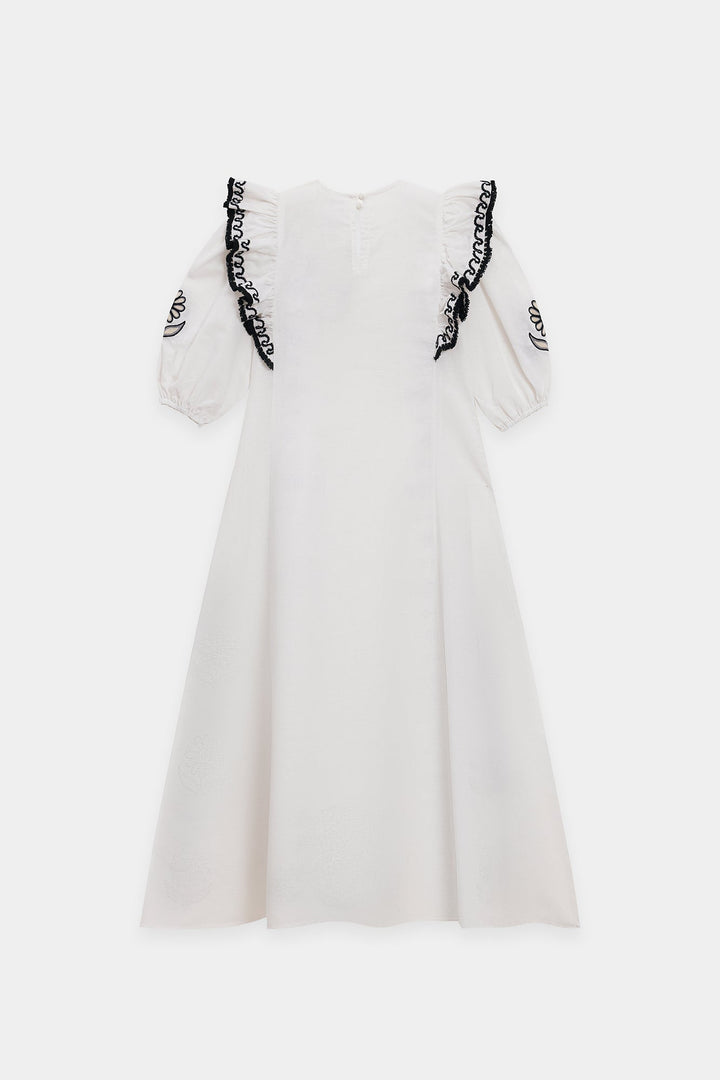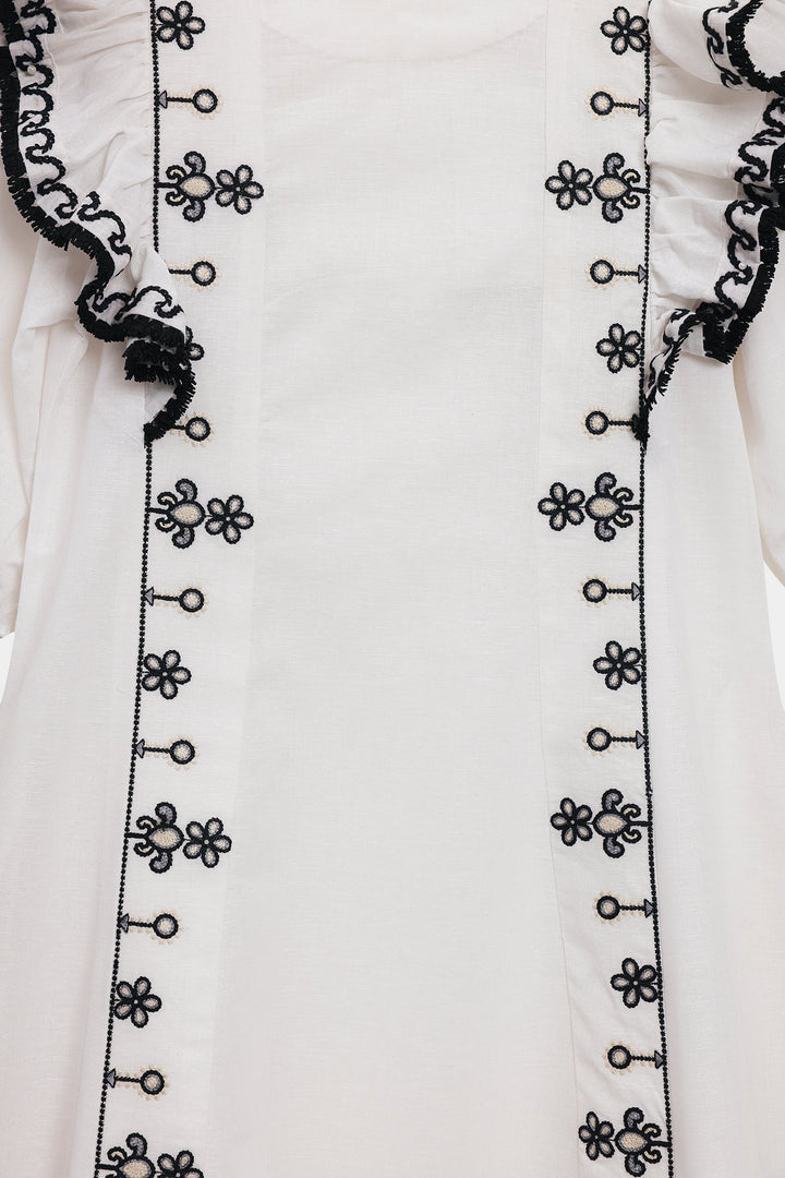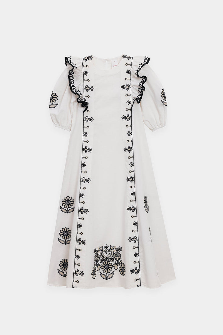 Make a memorable entrance in this stunning embroidered dress. This beautiful white dress features a comfortable, flowing silhouette. The ruffled-sleeve bodice is adorned with delicate black floral embroidery, with elasticated cuffs that add a touch of romance. The dress has a classic A-line shape with a flowing skirt. Perfect for any occasion, this dress is a versatile and stylish addition to your wardrobe.