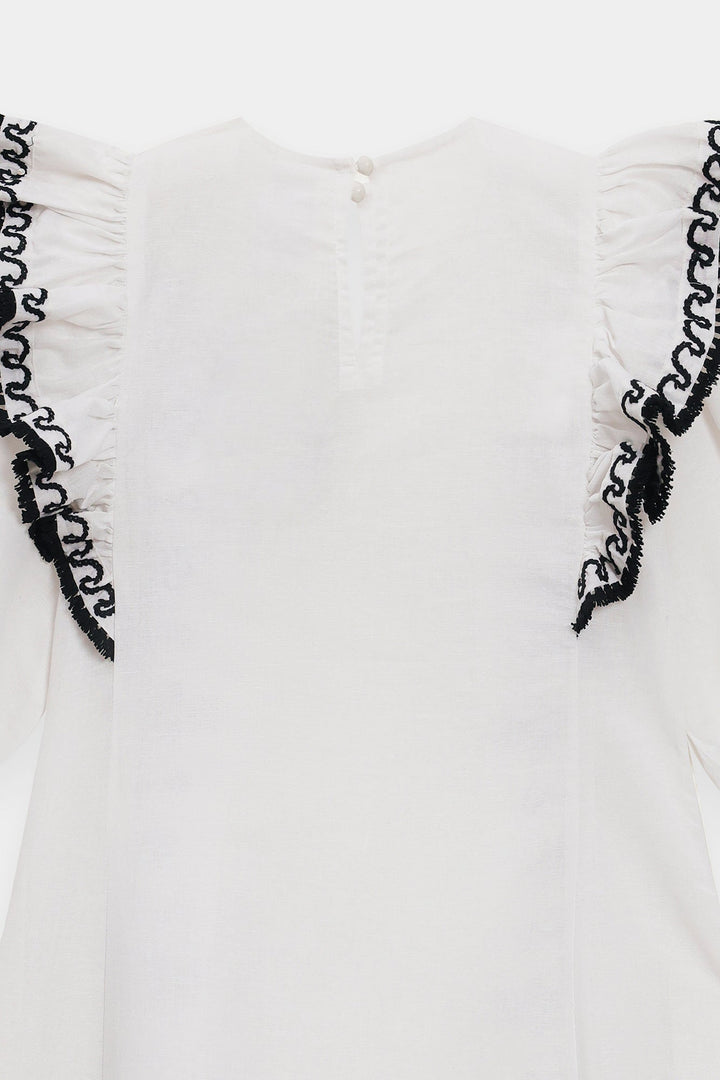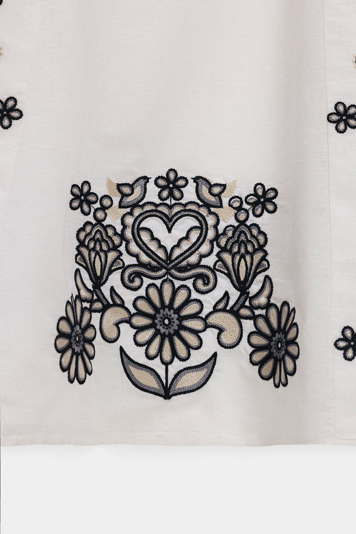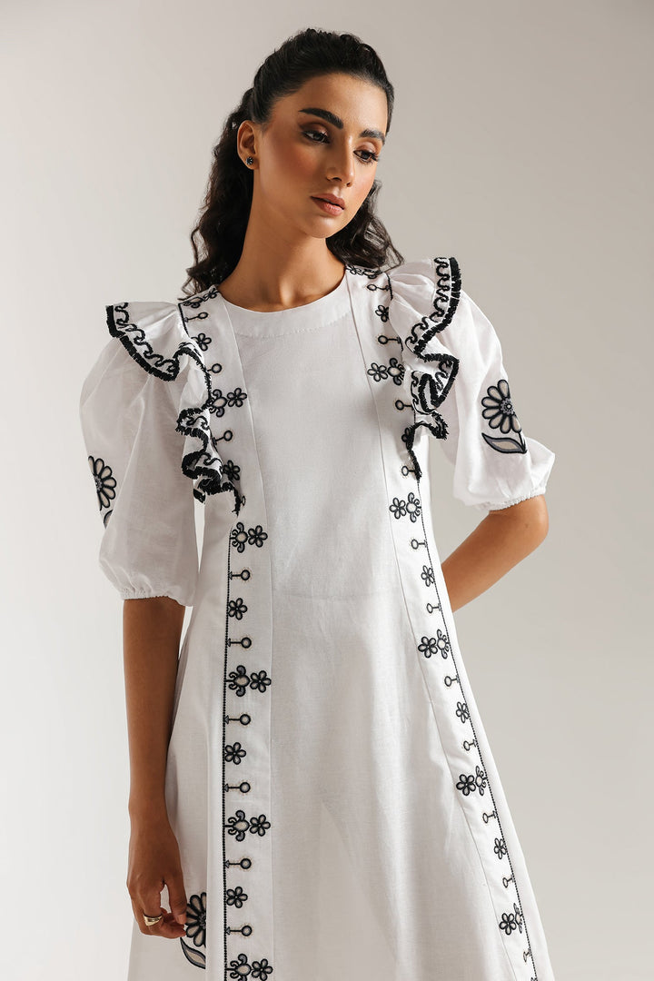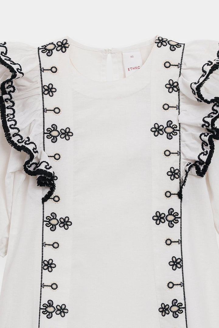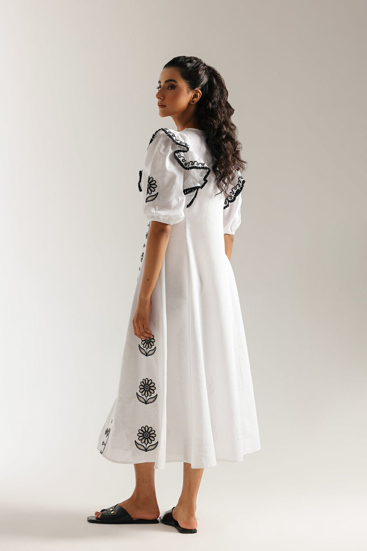 Make a memorable entrance in this stunning embroidered dress. This beautiful white dress features a comfortable, flowing silhouette. The ruffled-sleeve bodice is adorned with delicate black floral embroidery, with elasticated cuffs that add a touch of romance. The dress has a classic A-line shape with a flowing skirt. Perfect for any occasion, this dress is a versatile and stylish addition to your wardrobe.