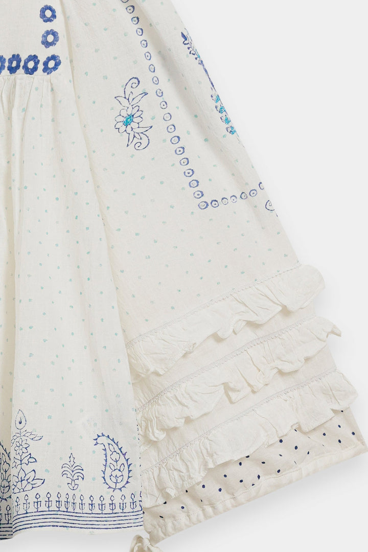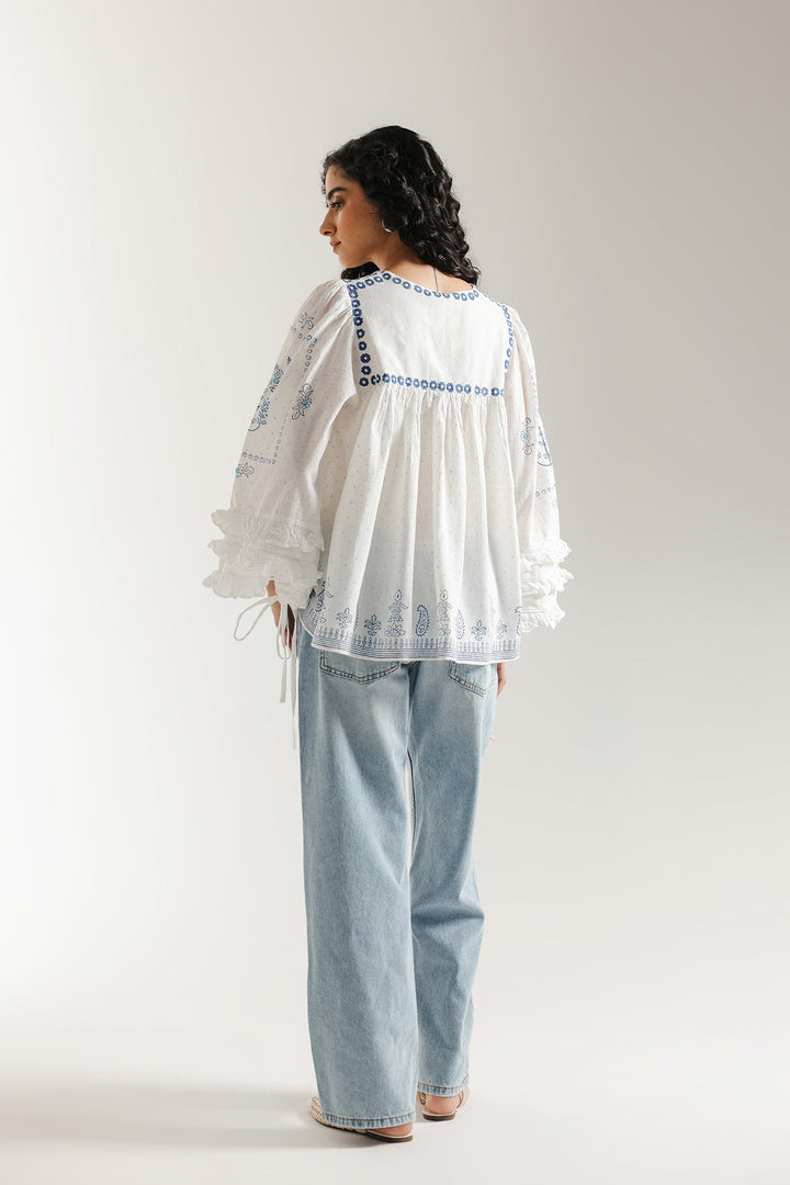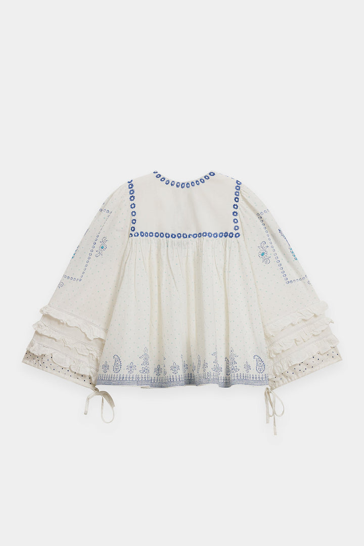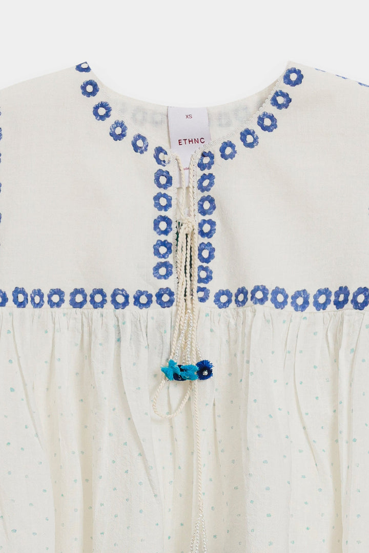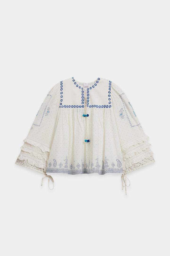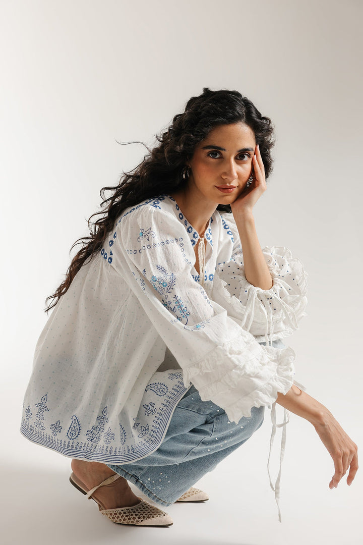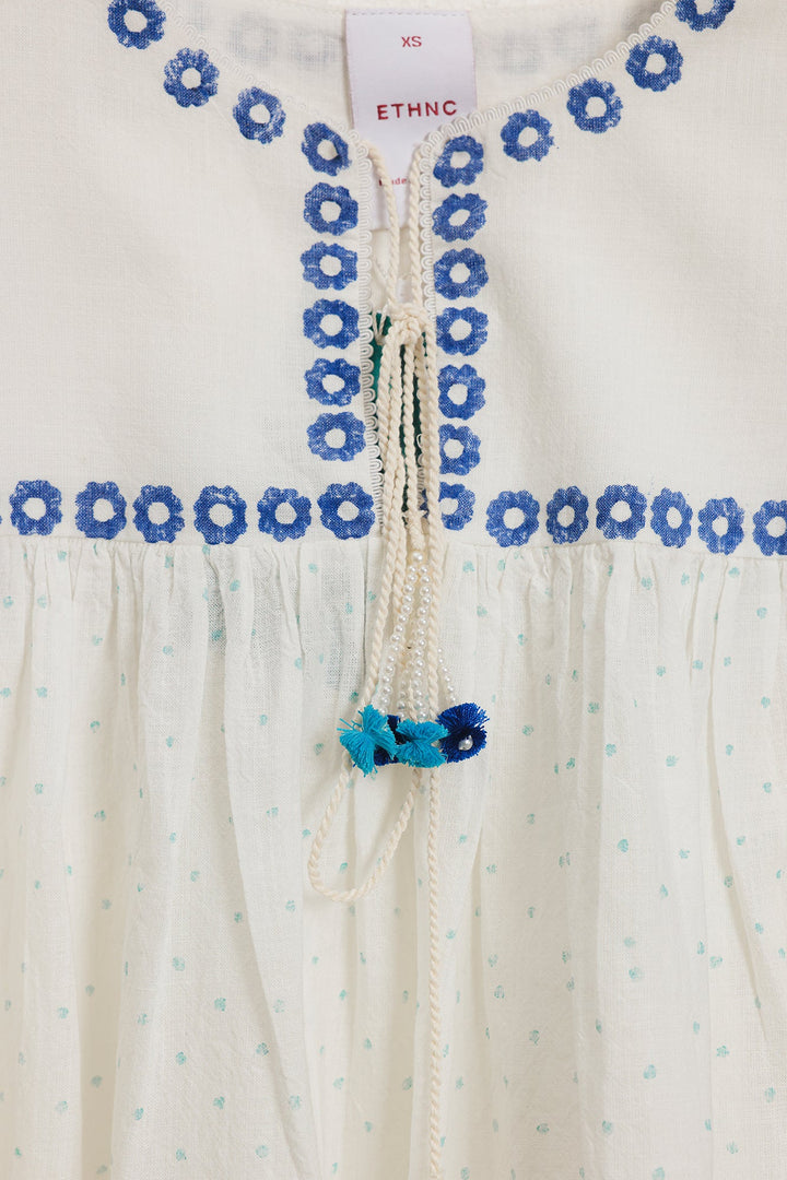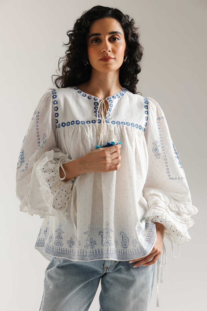 Float in dreamy bohemian charm with this striking white printed top. This voluminous top is crafted from a light, airy white fabric featuring a subtle dotted texture and an overall relaxed, peasant-style fit. The design is beautifully highlighted by bright blue print that forms delicate floral and border patterns across the neckline, front, and hem. The piece features a round neckline adorned with vibrant blue tassels, and the wide sleeves cascade down with ruffled layers at the cuff. It is finished with drawstrings at the cuff, adding to its romantic, flowy silhouette.