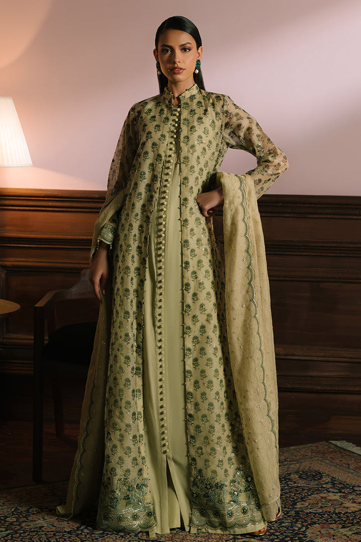 Indulge in luxury with the GLEAMING GOLD-4PC NET EMBROIDERED SUIT. The printed and embroidered shirt, adorned with 40" embroidered patti on the front, back, and sleeves, will make you stand out. Complete the look with a silk dyed slip, trouser, and net embroidered dupatta. Elevate your style with this elegant suit.