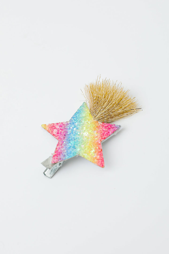 Mesmerizing yet trendy hair pin portrayed in flamboyant hues crafted in star silhouette and enhanced with threaded tassel. It is a great option of accessories for your girls to style with colorful outfits.