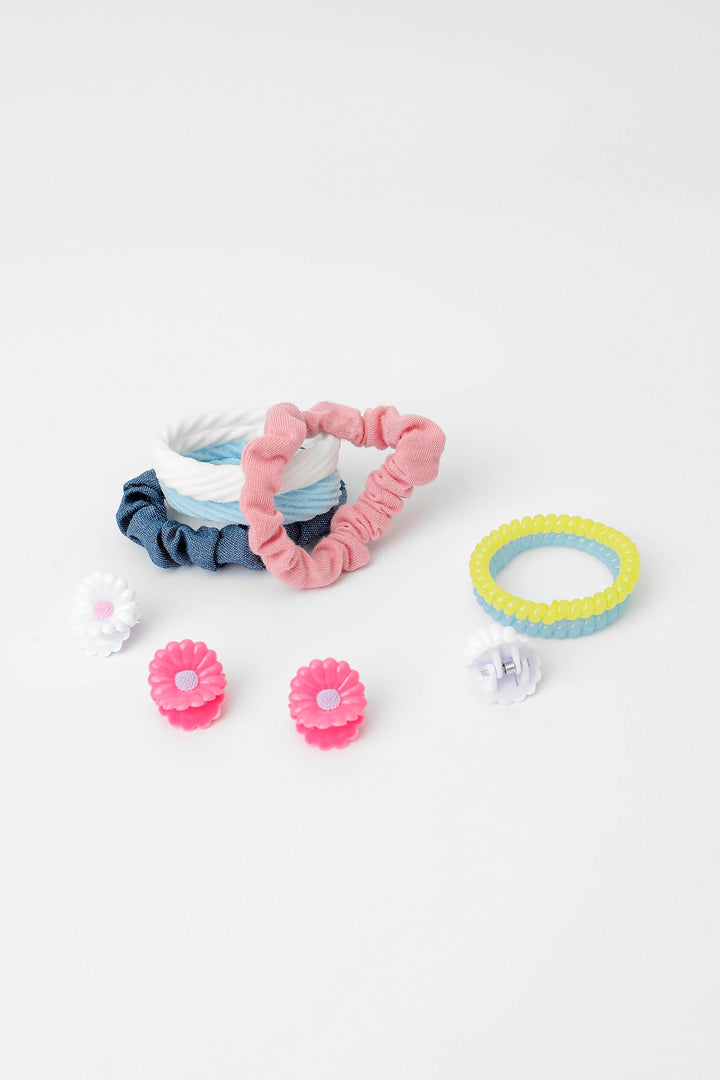 Contemporary yet trendy hair pins and ponies portrayed in flamboyant hues with floral designs. Style these elegant accessories with colorful outfits.