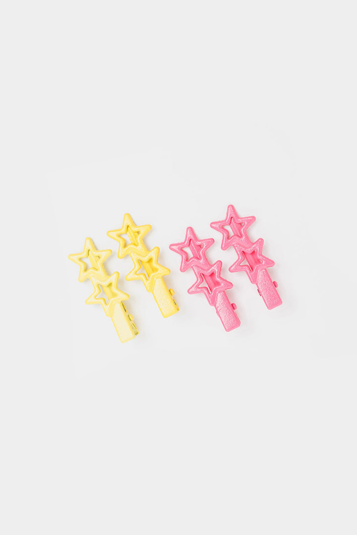 Add a unique touch to your hairstyle with pink and yellow pins, which are adorned with charming stars, adding a fun and playful element to any look. Perfect for adding a pop of color and sparkle to your kids hair.
