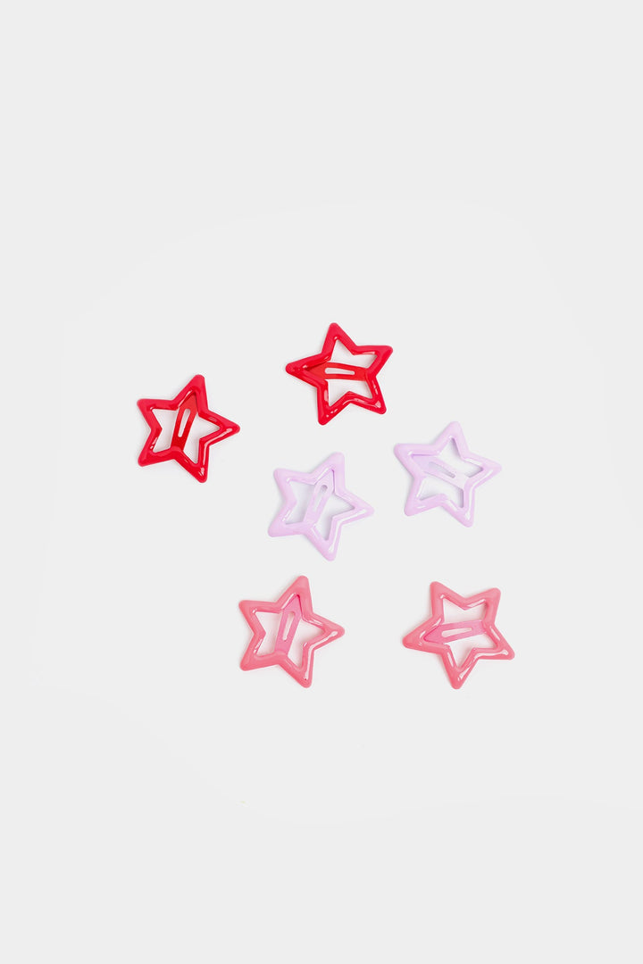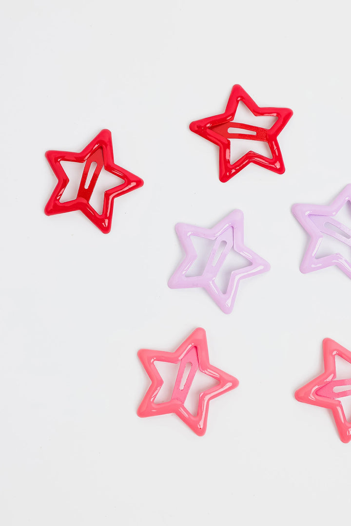 Add a playful and whimsical touch to any hairstyle with this delightful set of star-shaped snap hair clips. This collection includes six vibrant clips, featuring two in a cheerful red, two in a soft ice pink, and two in a charming lavender purple. Each clip is designed in an open star silhouette, offering a fun and secure way to hold hair in place.
