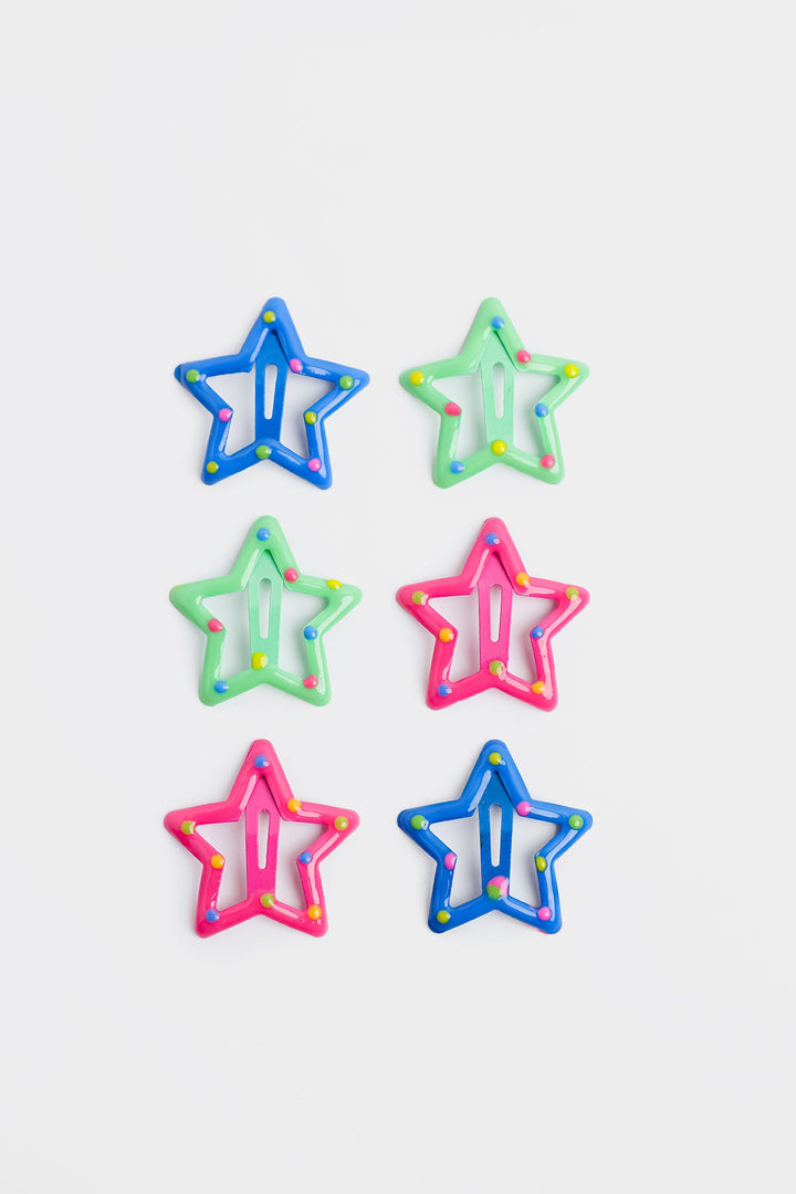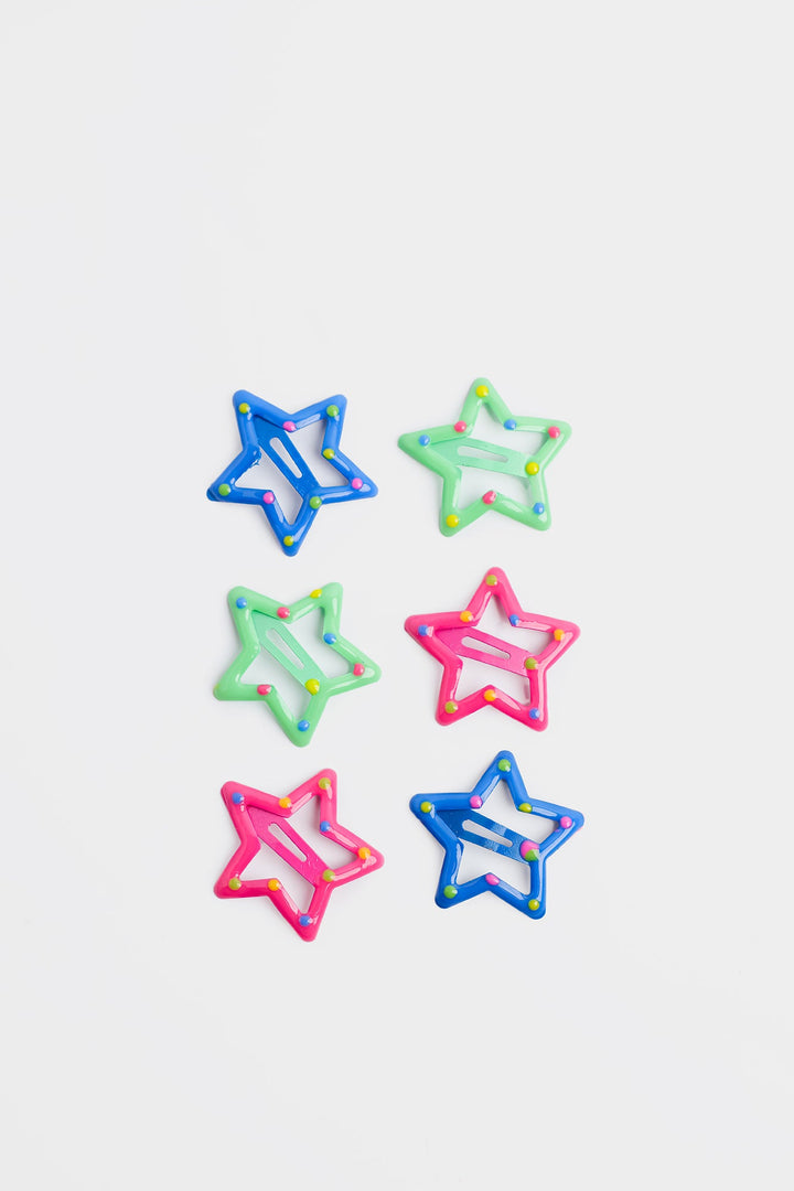 Add a playful and whimsical touch to any hairstyle with this delightful set of star-shaped snap hair pins. This collection includes six vibrant clips, featuring two in a cheerful pink, two in mint green and two in ice blue. Each clip is designed in an open star silhouette, offering a fun and secure way to hold hair in place.