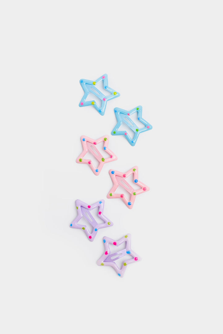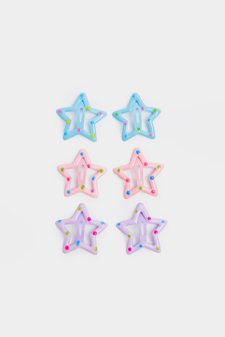 Add a playful and whimsical touch to any hairstyle with this delightful set of star-shaped snap hair pins. This collection includes six vibrant pins. Each pin is designed in an open star silhouette, offering a fun and secure way to hold hair in place.