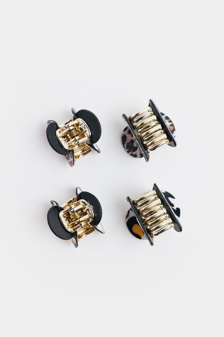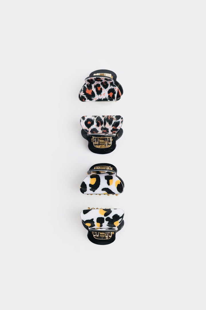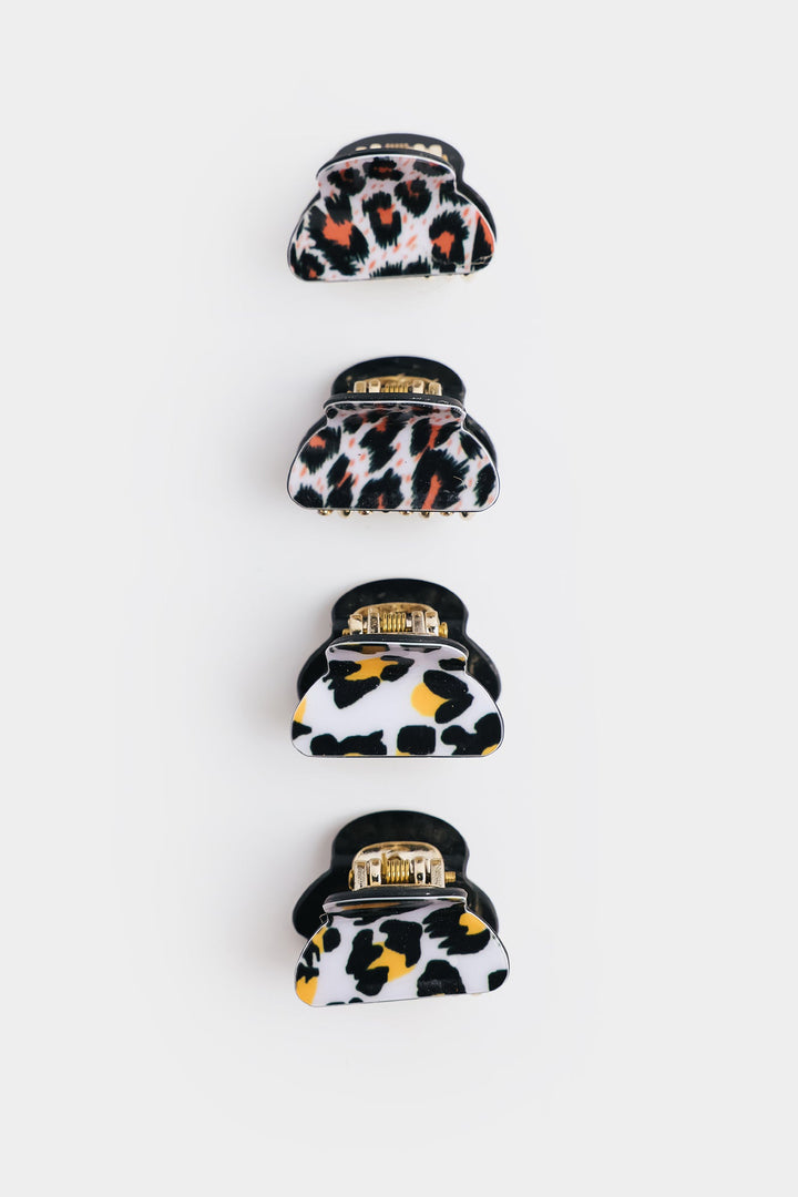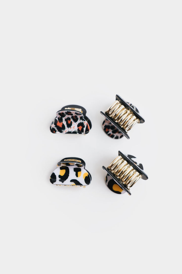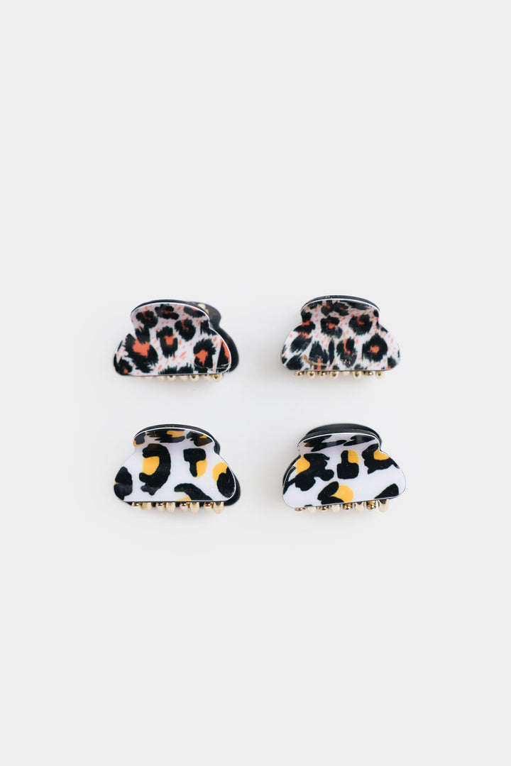 This exquisite set of four mini claw clips captures the alluring spirit of the wild in two distinctive, captivating patterns. Revel in the rich, earthy tones of classic brown leopard print, or embrace the bold, artistic strokes of black and white spots illuminated by unexpected flashes of yellow and orange. These trendy accessories are perfect for adding a secure and stylish touch to any hairstyle.