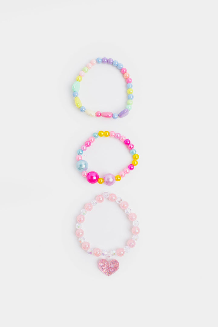 Adorn your wrists with a rainbow of sweetness! This charming set of three elastic bracelets features a delightful mix of pastel beads, iridescent finishes, and a dazzling glitter heart charm, perfect for layering or wearing individually.