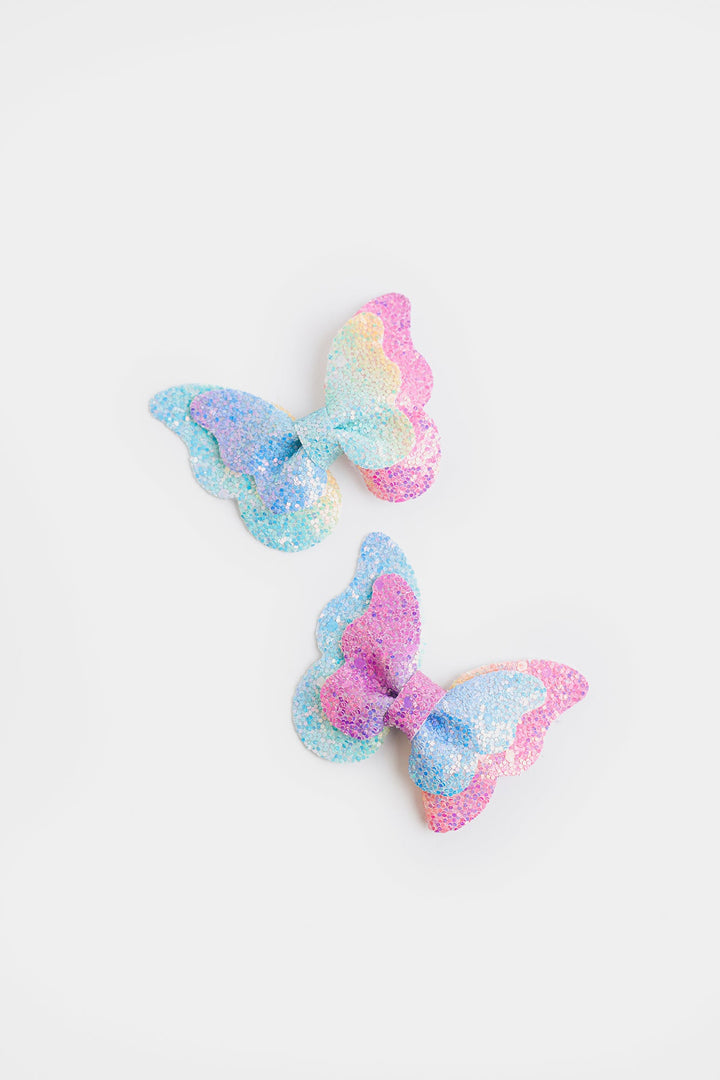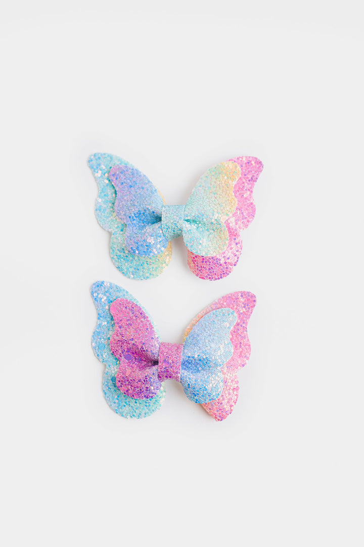 Let your hair shine with these stunning glitter butterfly clips! Featuring a beautiful ombre blend of pastel hues and all-over sparkle, this duo adds a vibrant, whimsical touch to any hairstyle.