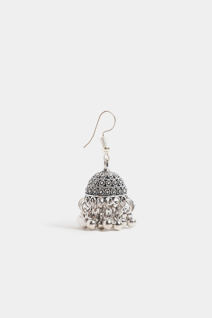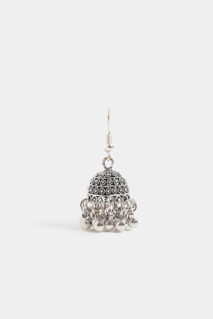 Elevate your traditional look with these stunning silver jhumka earrings. These earrings feature a classic dome shape richly adorned with intricate detailing on the top half. The bottom half of the jhumka is adorned with multiple cascading silver medallions, designed to create a subtle, enchanting movement and sound. These are a timeless accessory for any festive or formal occasion.